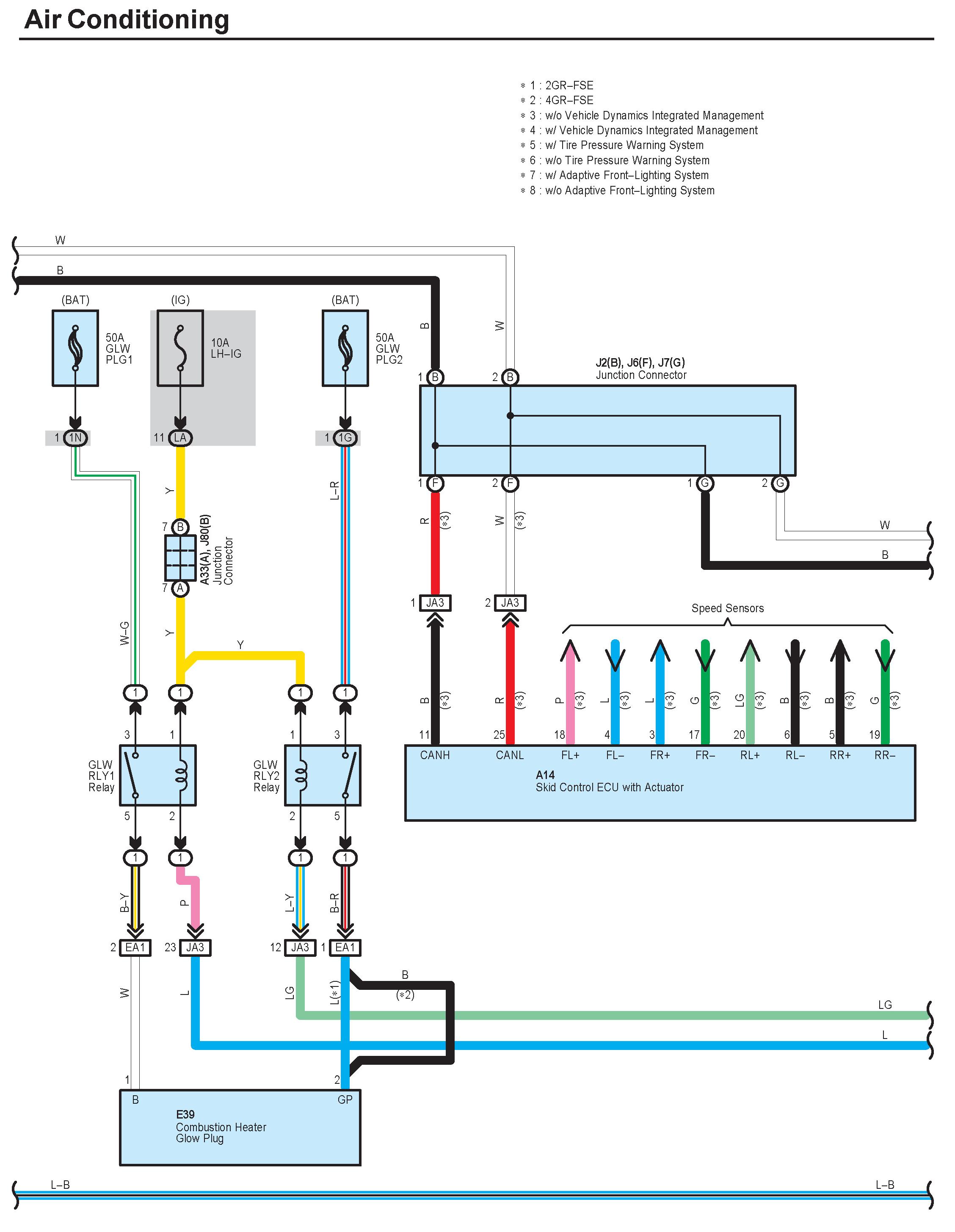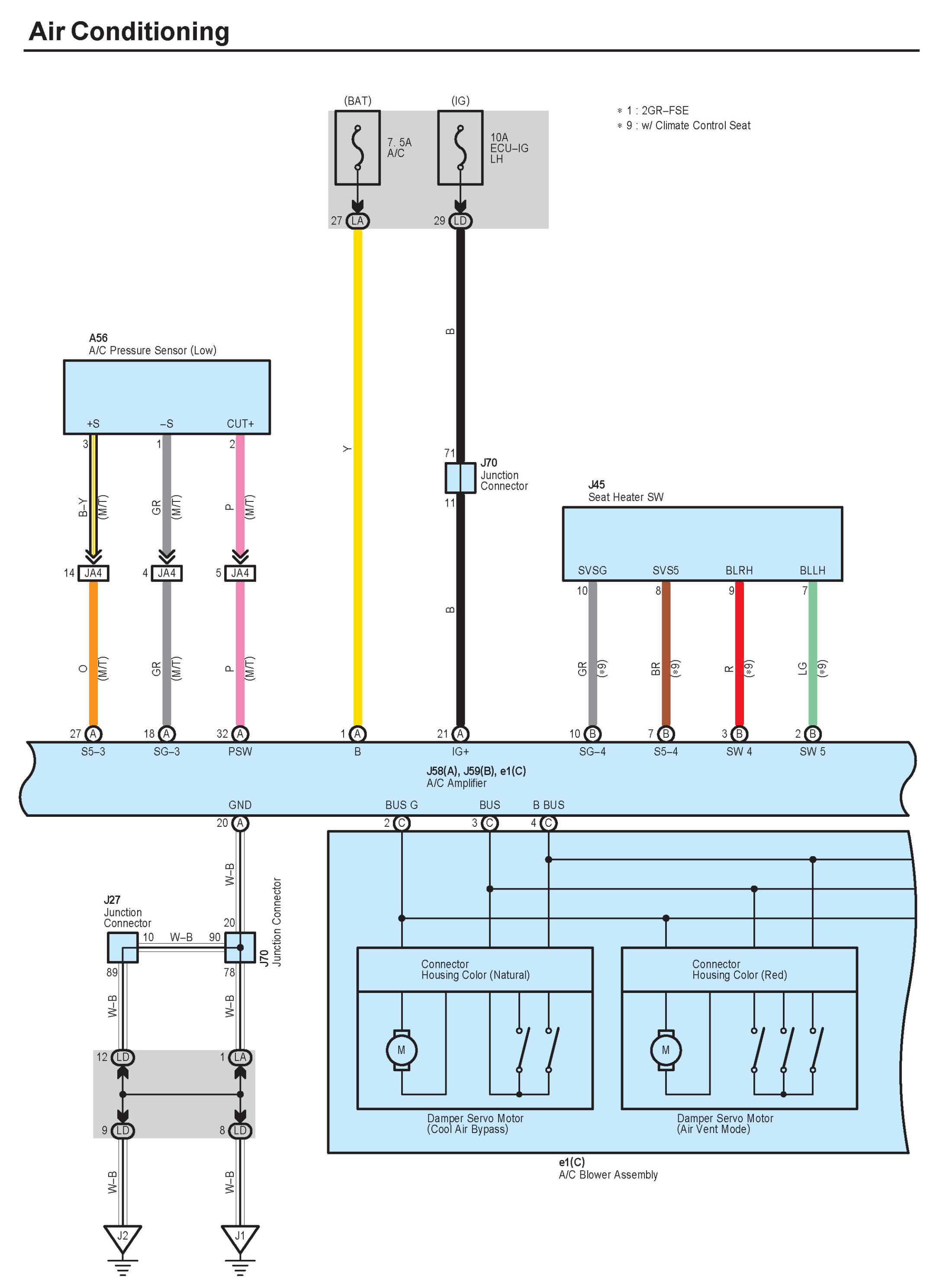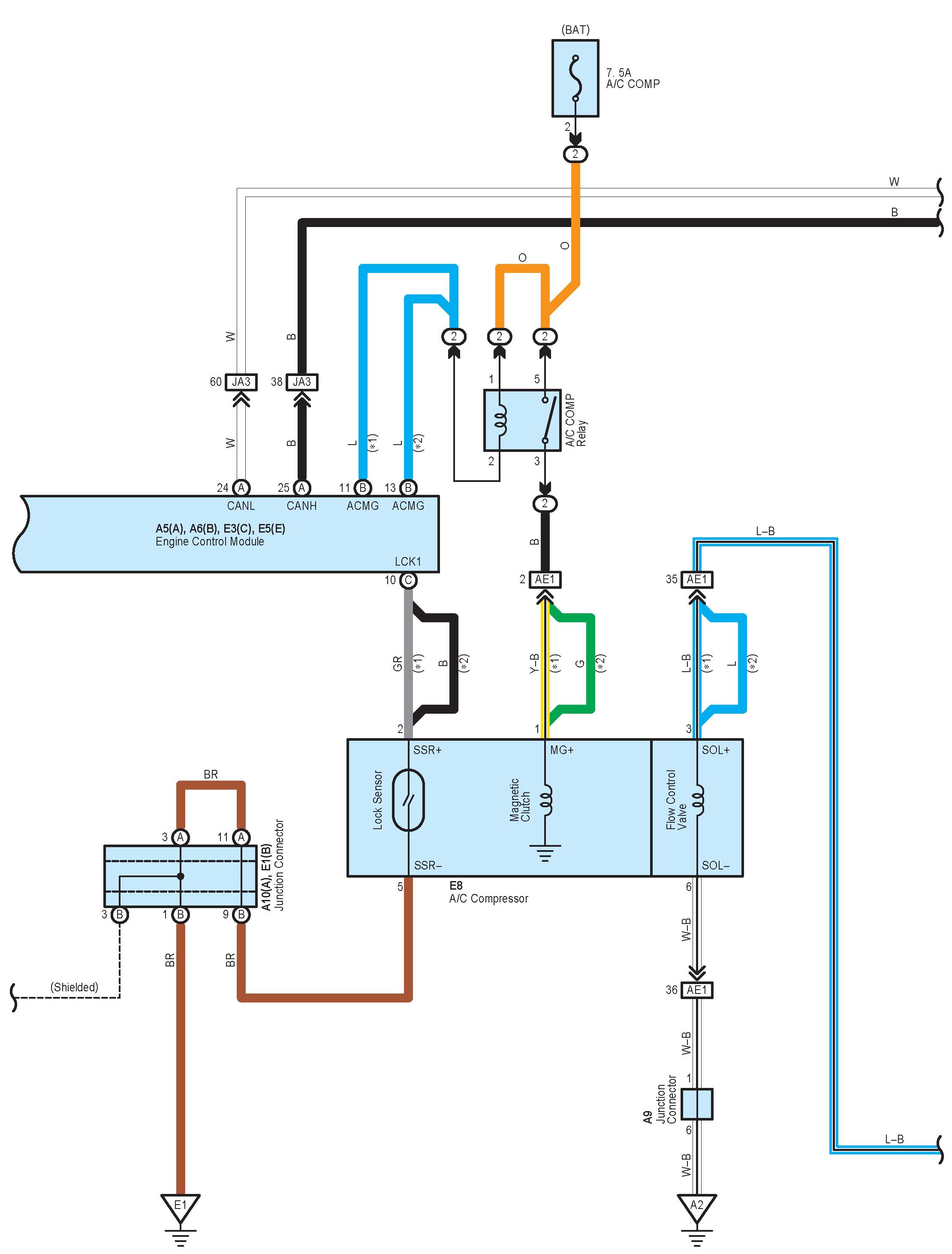 NOTE: Lexus uses a magnetic clutch type compressor as well as a flow control valve type. Both are contained within the diagram. Follow the portion of the digram applicable to the vehicle.
