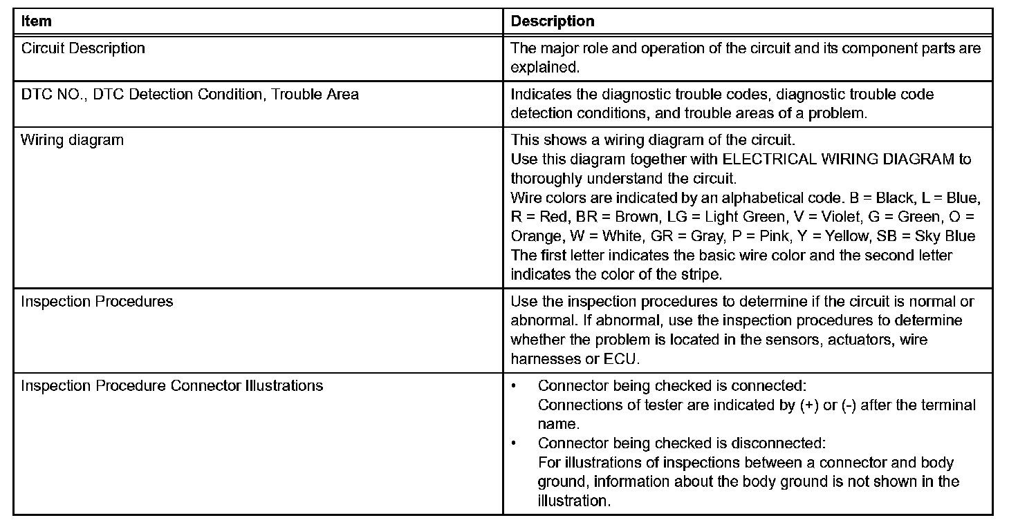 A description of the main areas of each circuit inspection is shown in the table.