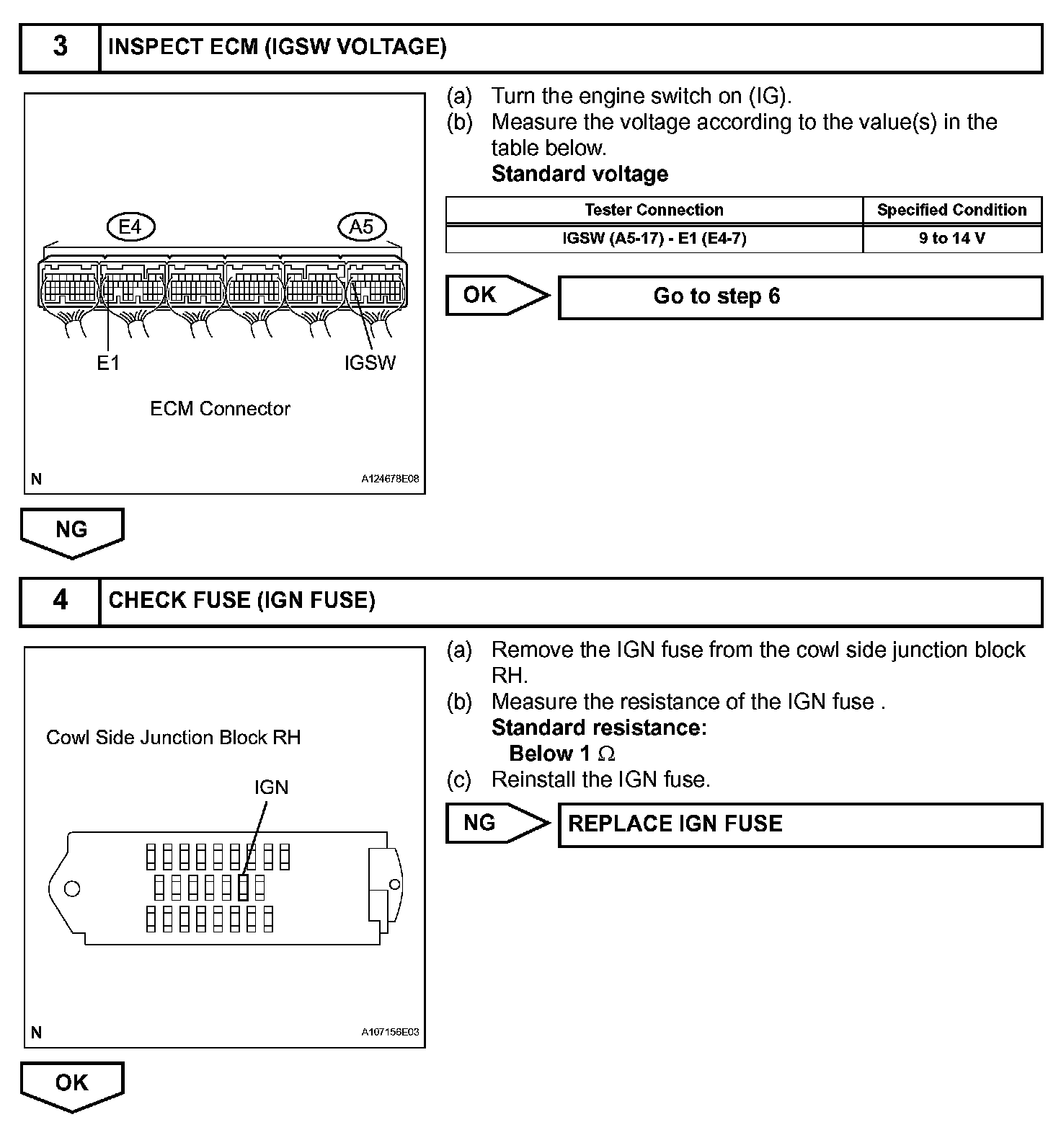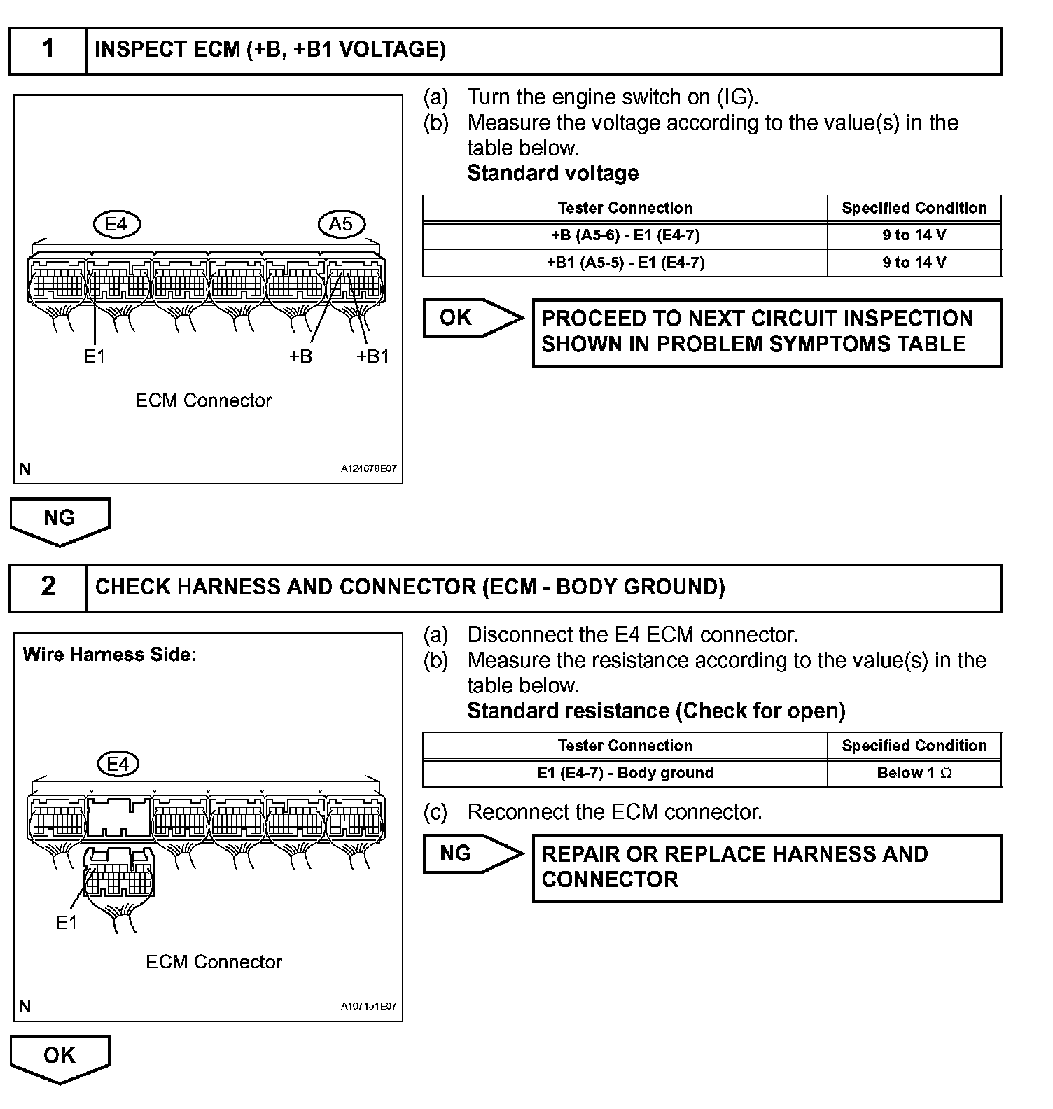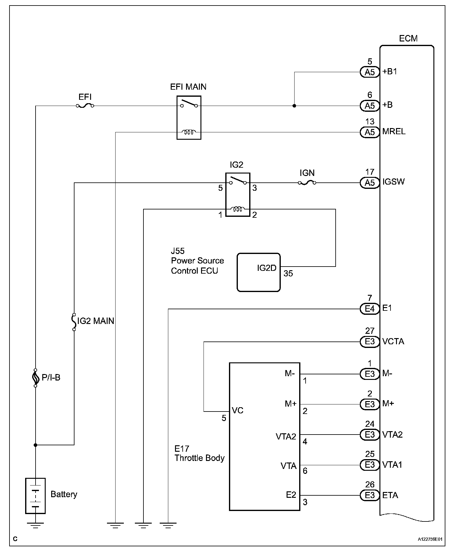 When the engine switch is turned on (IG), the battery voltage is applied to terminal IGSW of the ECM. The ECM MREL output signal causes a current to flow to the coil, closing the contacts of the EFI MAIN relay and supplying power to terminal +B of the ECM.