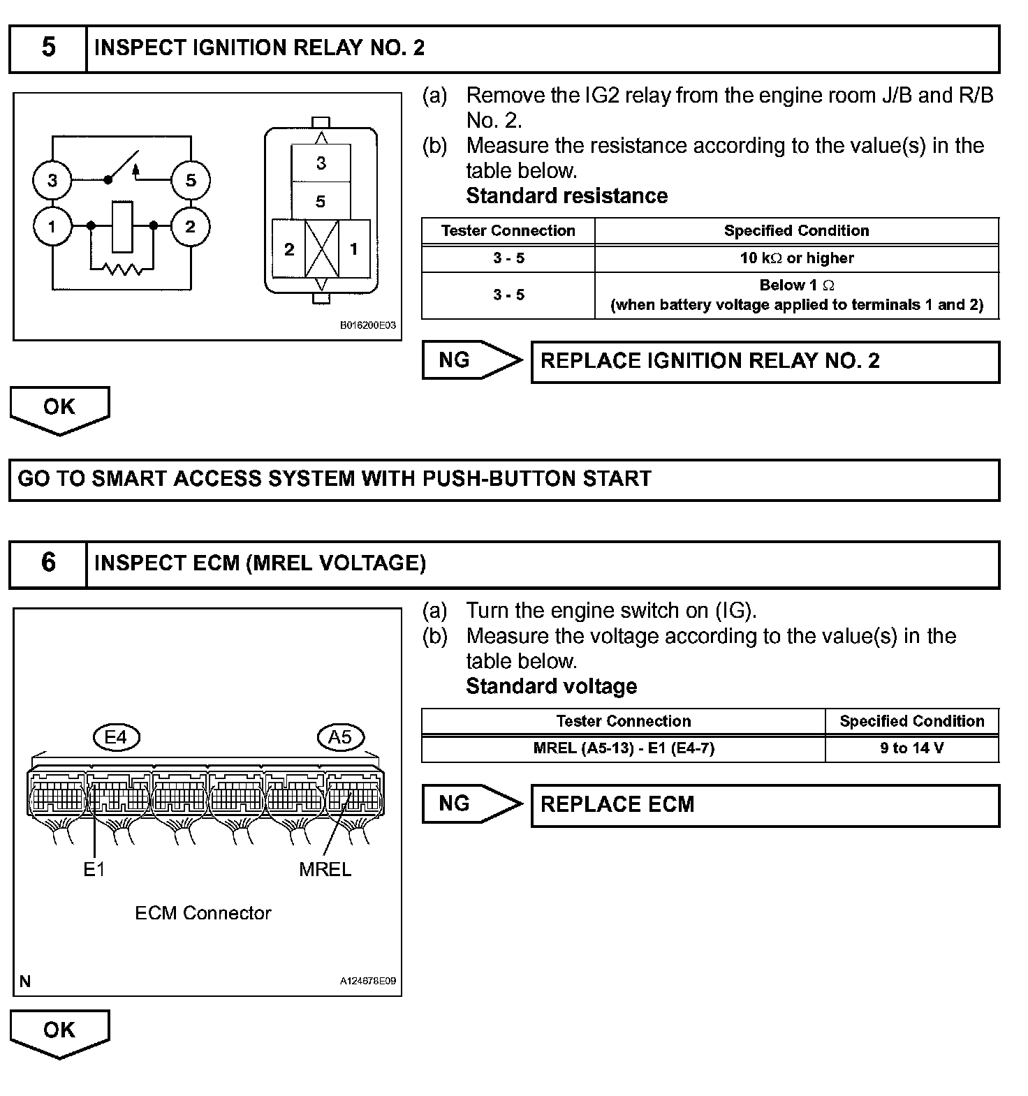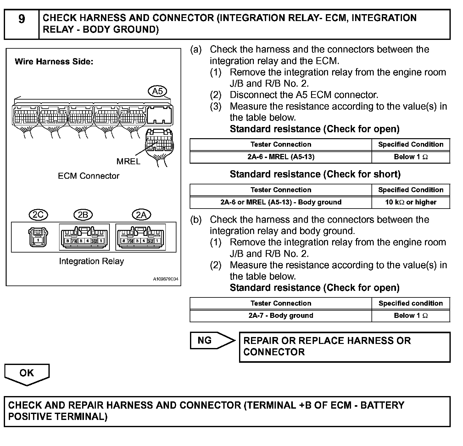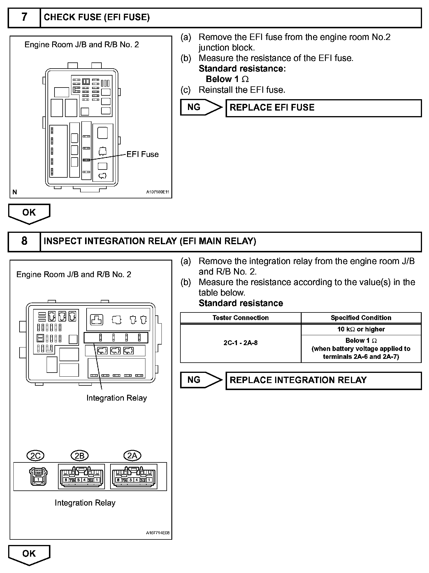 When the engine switch is turned on (IG), voltage from the ECM's MREL terminal applies to the integration relay (EFI MAIN relay). This causes the contacts of the integration relay (EFI MAIN relay) to close, which supplies power to terminal +B or +B1 of the ECM.