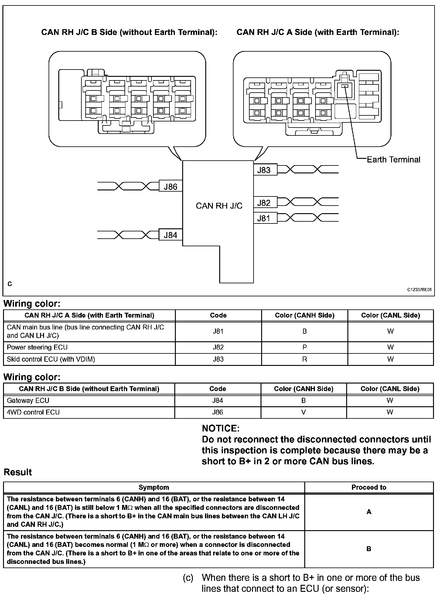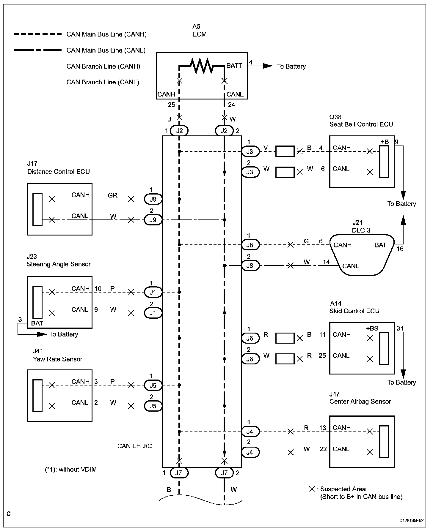 A short to B+ is suspected in the CAN bus line when the resistance between terminals 6 (CANH) and 16 (BAT), or terminals 14 (CANL) and 16 (BAT) of the DLC3 is below 1 MOhm.