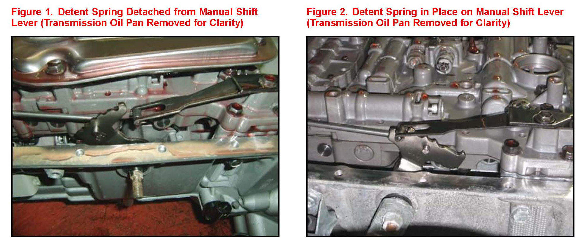 ^ If the detent spring becomes detached from the manual shift lever remove the detent spring and reinstall on the manual shift lever. See Figures 1 and 2.
