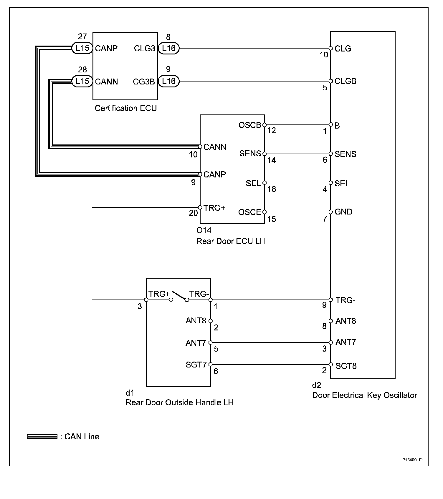 If the rear right door entry unlock function does not operate but the entry lock operation operates, the communication line between the vehicle and electrical key transmitter is normal. Either of the following may have occurred: 1) the door outside handle touch sensor is malfunctioning; or 2) the rear door ECU RH receives the door outside handle touch sensor ON signal, but is unable to send the signal to the certification ECU through CAN communication.