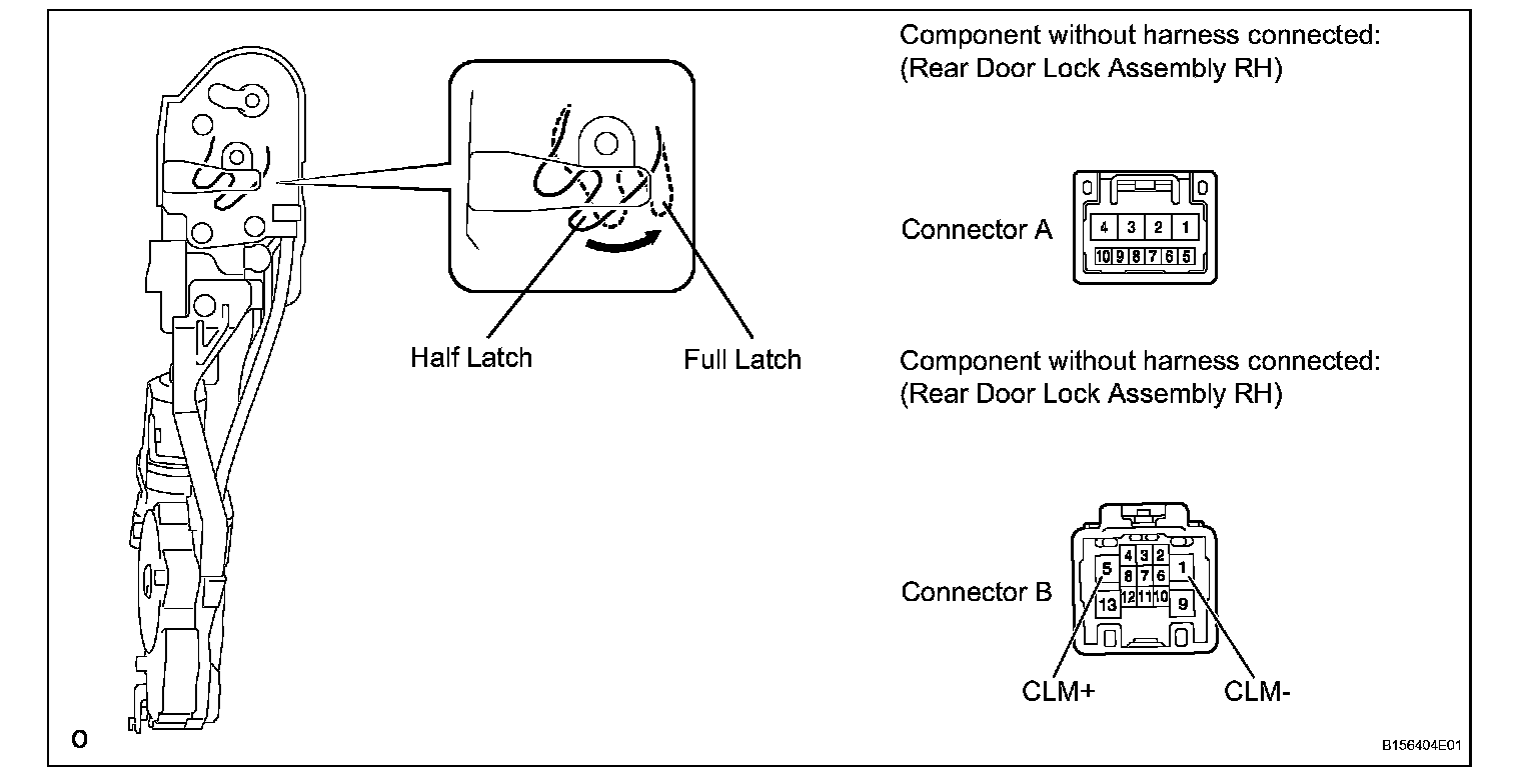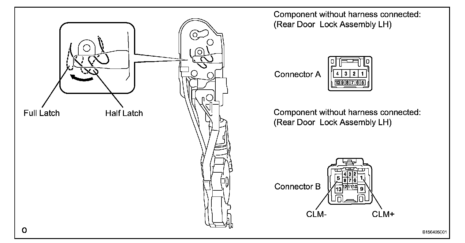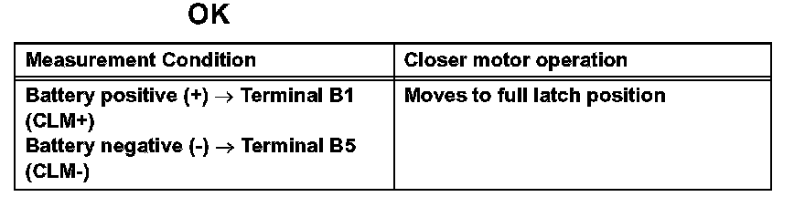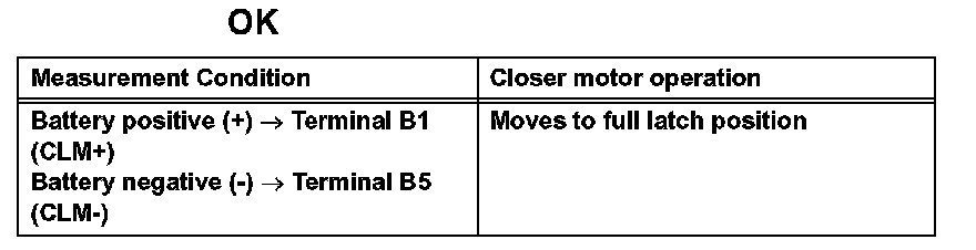 2. When battery voltage is applied as shown given to the terminals of connector B of the rear door with motor lock assembly LH, check the operation of the door closer