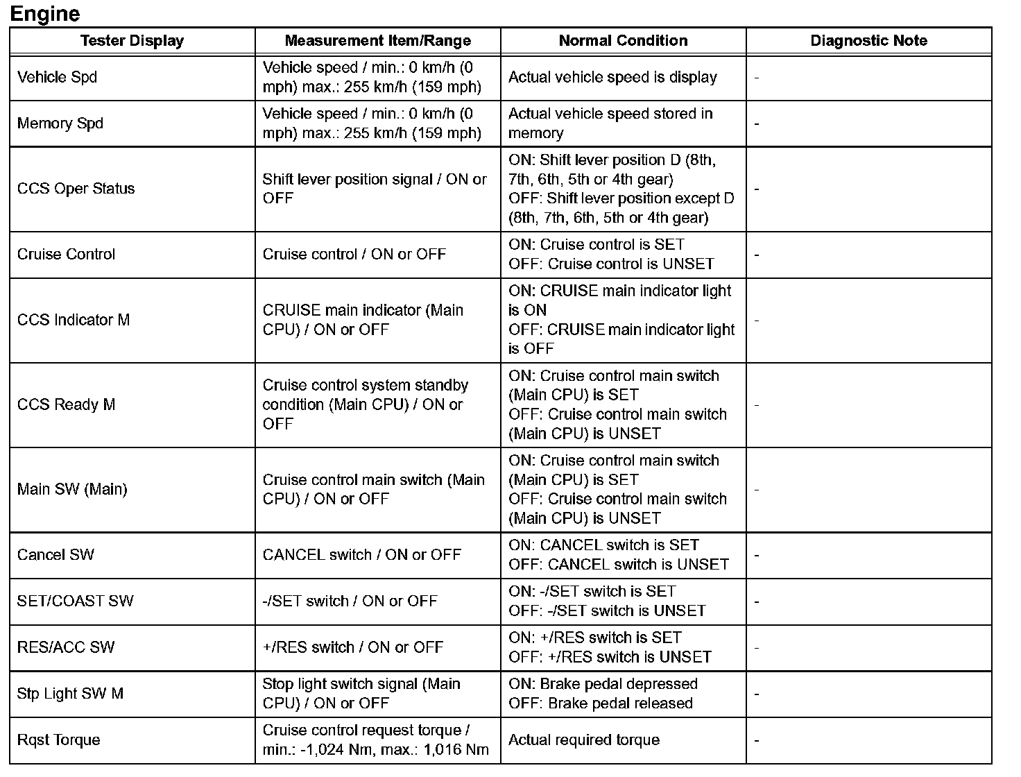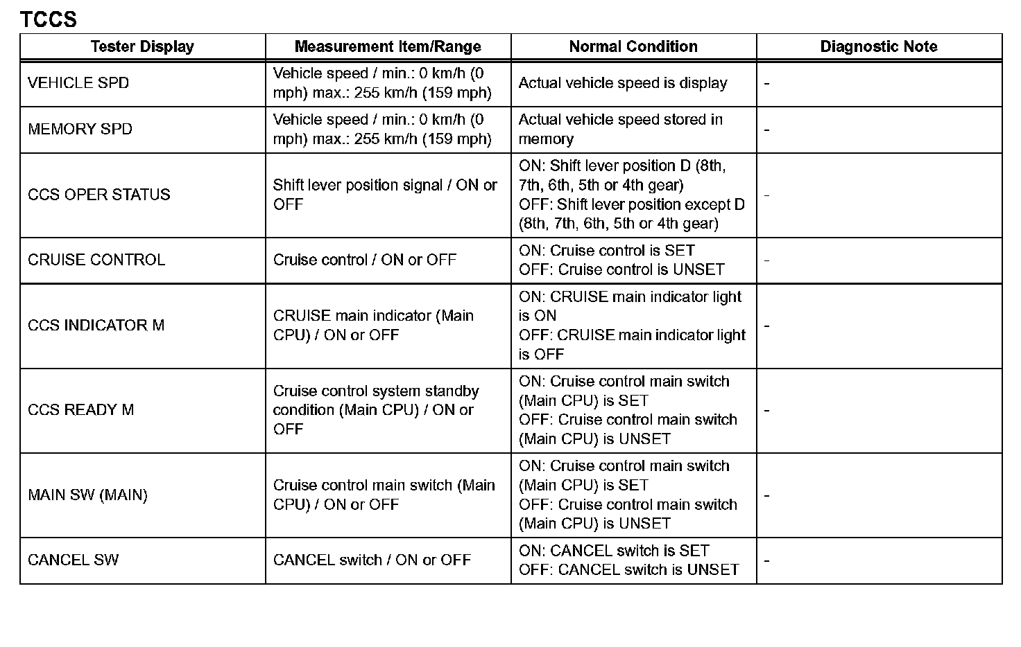 NOTE: In the table given, the values listed under "Normal Condition" are reference values. Do not depend solely on these reference values when deciding whether a part is faulty or not.