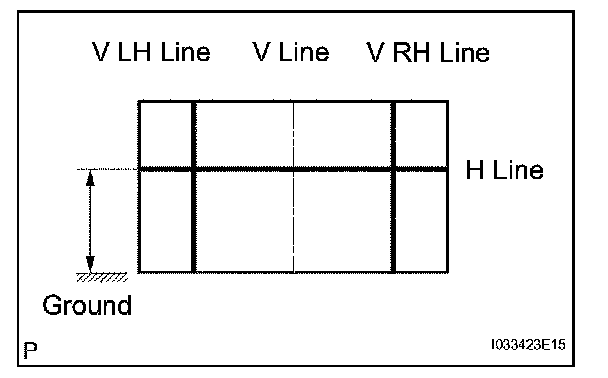 Draw a horizontal line across the screen so that it passes through the center marks. The H line should be at the same height as the headlight bulb center marks of the low-beam headlights.