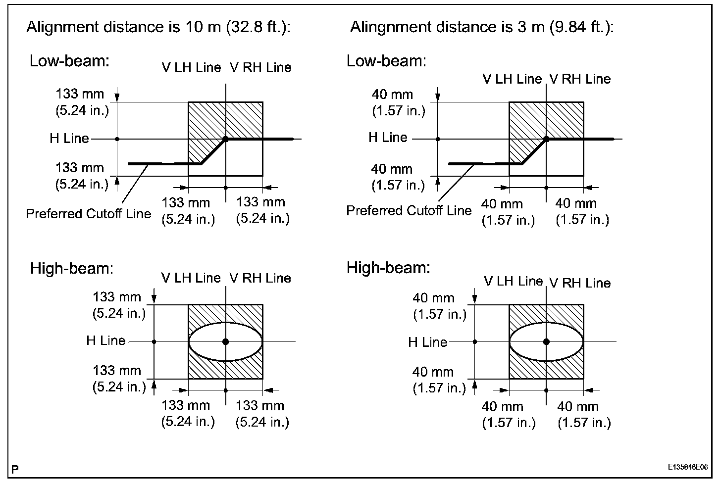 - If the alignment distance is 10 m (32.8 ft.): The cutoff line should be within 133 mm (5.24 in.) above or below the H line as well as 101.6 mm (4 in.) left or right of the V line with low-beam.