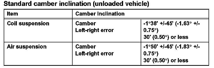 Standard camber inclination (unloaded vehicle):