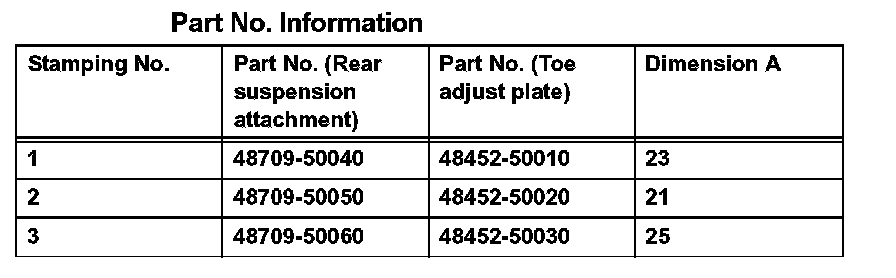 ^ The toe-in will change by the following specification corresponding to each graduation of the cam: Approximately: 4.8 mm (0.19 in.)