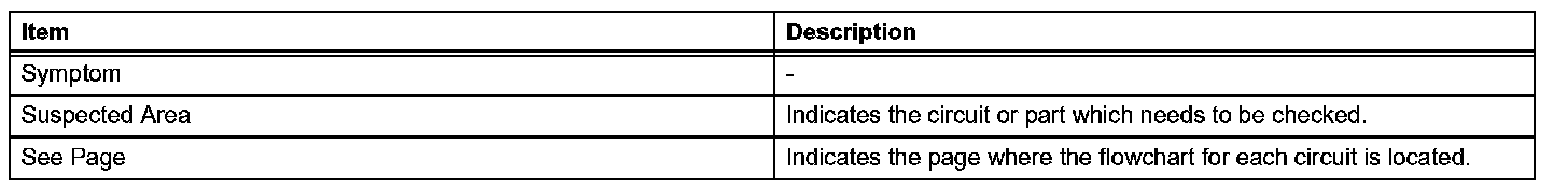 PROBLEM SYMPTOMS TABLEWhen a "Normal" code is output during a DTC check but the problem is still occurring, use the Problem Symptoms Table. The suspected areas (circuits or parts) for each problem symptom are in the table. The suspected areas are listed in order of probability. A description of each of the chart's columns.