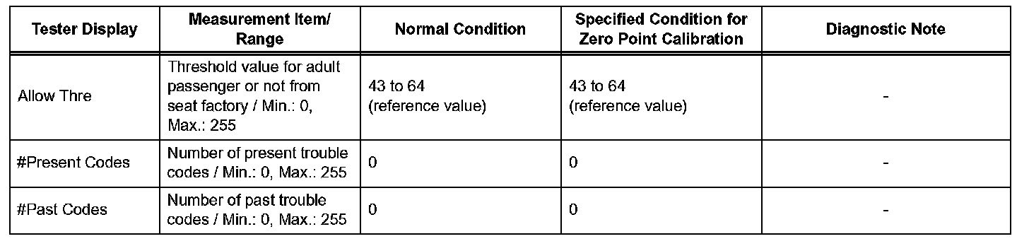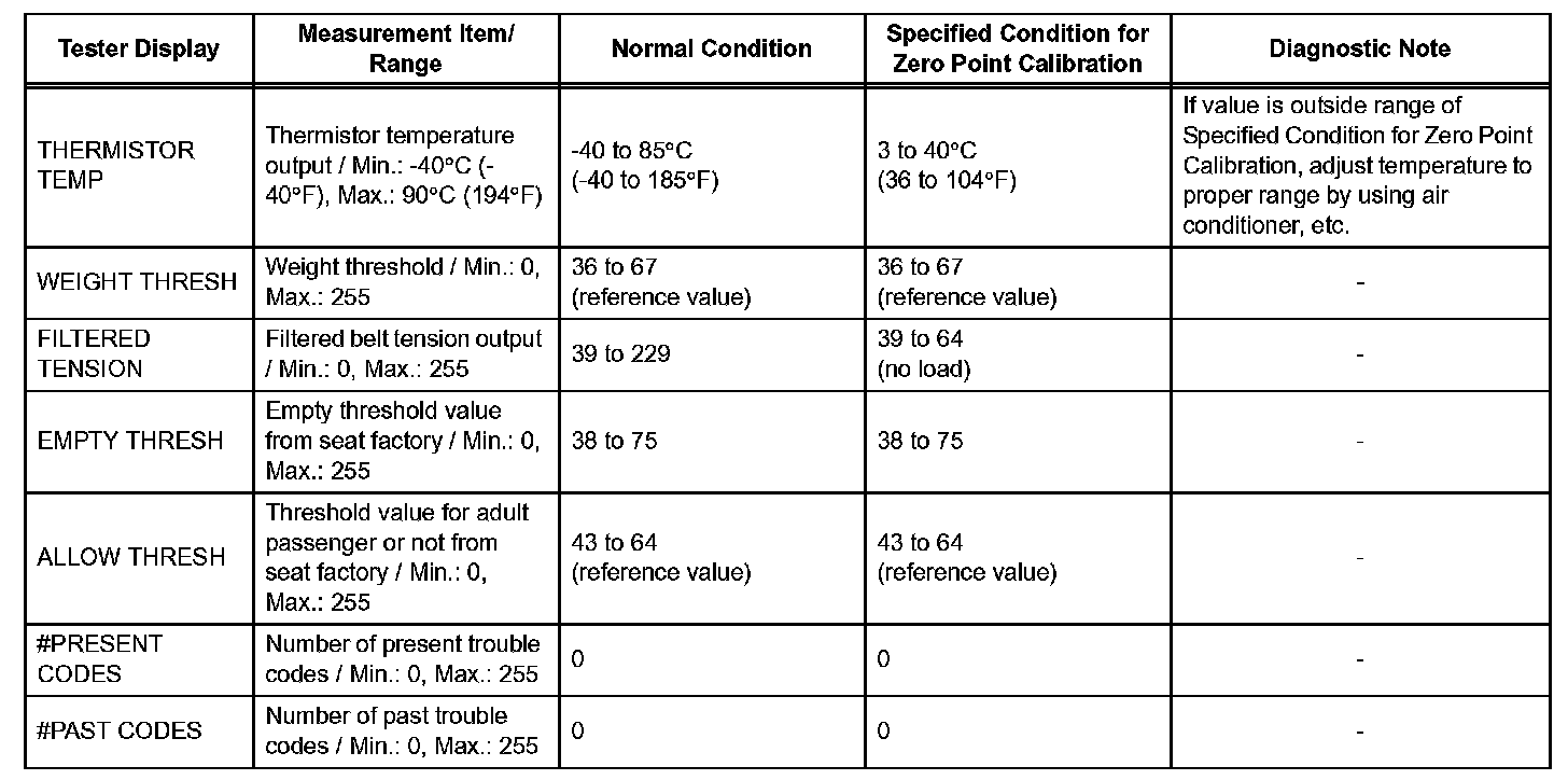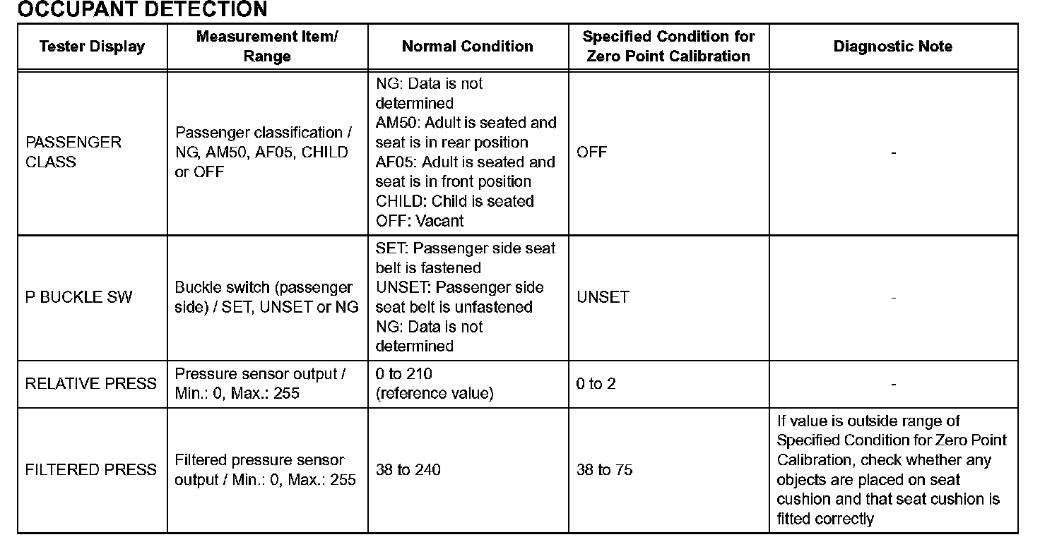 DATA LIST FOR OCCUPANT CLASSIFICATION ECUHINT: Using the intelligent tester or Techstream to read the DATA LIST allows the values or states of switches, sensors, actuators and other items to be read without removing any parts. This non-intrusive inspection can be very useful because intermittent conditions or signals may be discovered before parts or wiring is disturbed. Reading the DATA LIST information early in troubleshooting is one way to save diagnostic time.