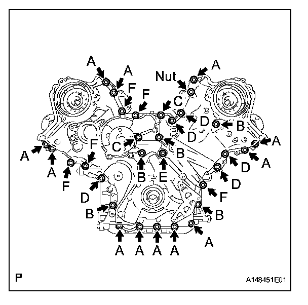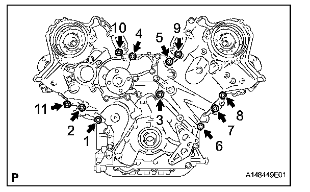 TIMING CHAIN COVERTemporarily tighten the timing chain cover with the 30 bolts and nut.