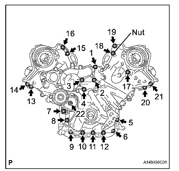 Tighten the 21 bolts and nut in several steps, in the sequence shown in the illustration.