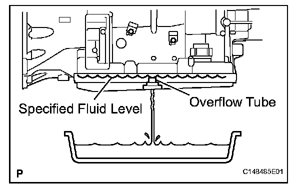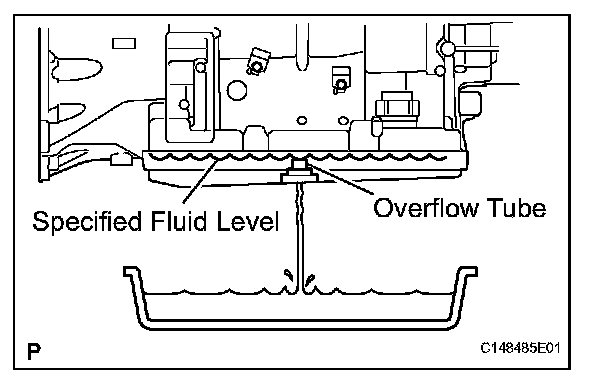 If the ATF does not flow from the overflow tube, add ATF into the refill hole until ATF flows from the overflow tube. If the ATF flows in a thin stream, the fluid amount is normal.