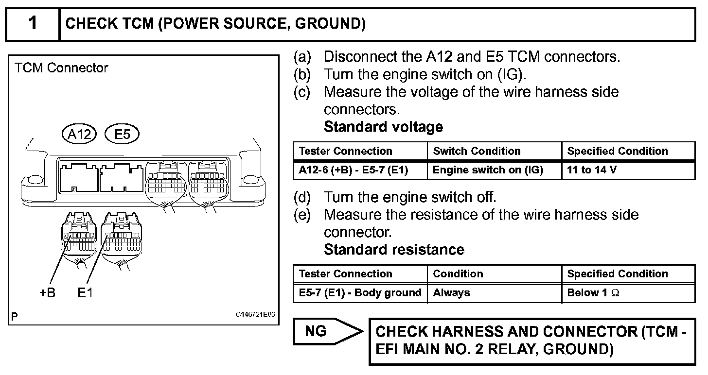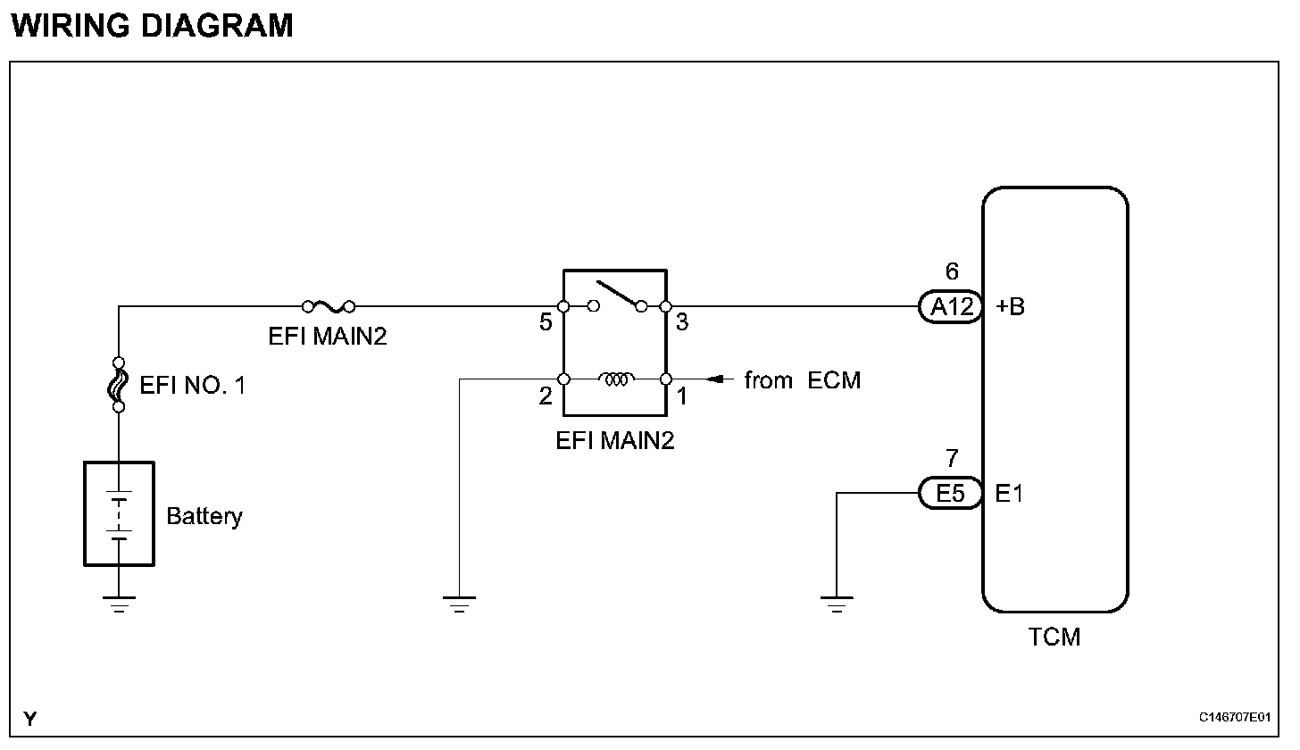 When the engine switch is turned on (IG), voltage from the ECM's MREL terminal is applied to the EFI MAIN 2 relay. This causes the contacts of the EFI MAIN 2 relay to close, which supplies power to terminal +B of the TCM.