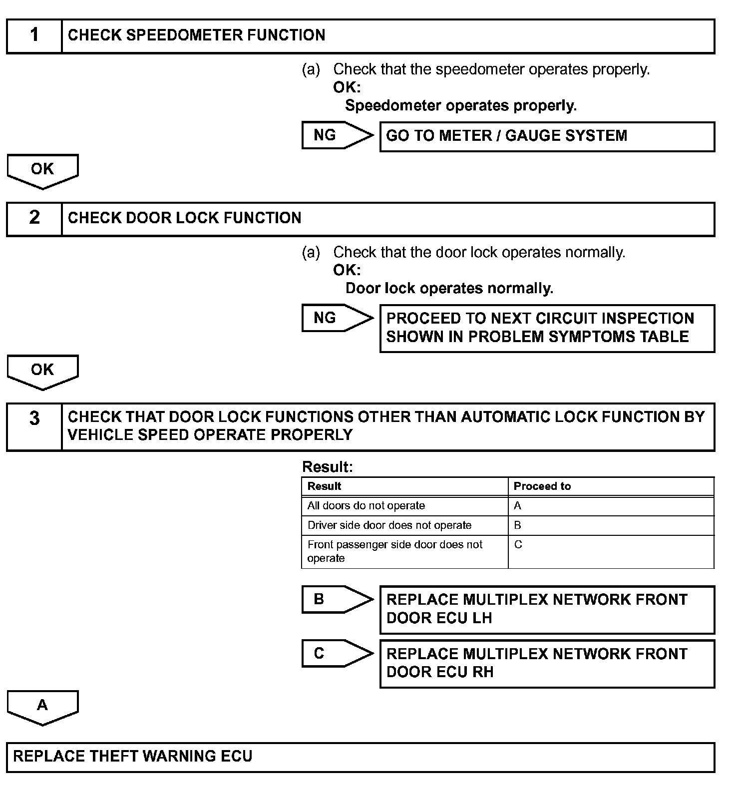 The theft warning ECU monitors vehicle speed signals transmitted from the meter ECU, and it will drive each door lock motor when any of the doors is in the unlocked state with the vehicle speed at approximately 20 km/h (13 mph).