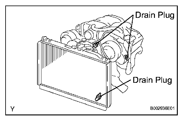 (b) Loosen the radiator drain cock plug and 2 cylinder block drain cock plugs. Then drain the coolant.