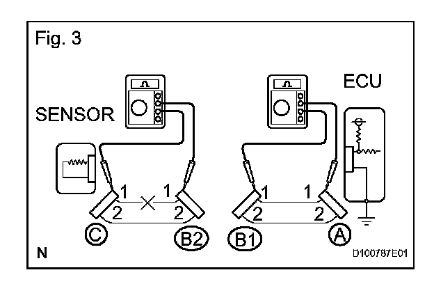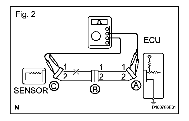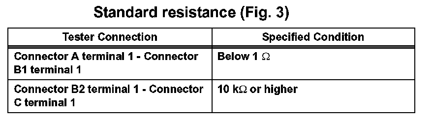 If the results match the examples above, an open circuit exists in the wire harness between terminal 1 of connector B and terminal 1 of connector C.