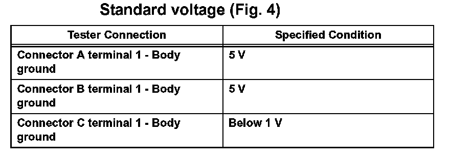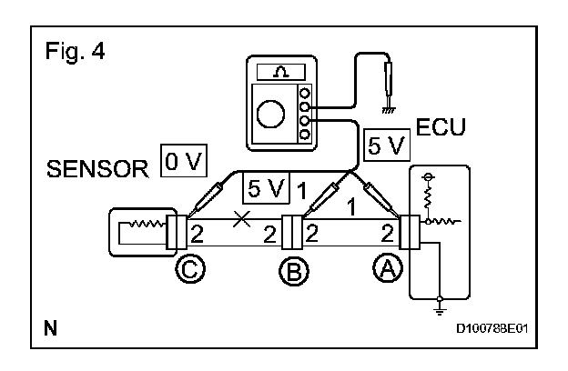 1. In a circuit in which voltage is applied to the ECU connector terminal, an open circuit can be checked by conducting a voltage check. With each connector still connected, measure the voltage between the body ground and these terminals (in this order): 1) terminal 1 of connector A, 2) terminal 1 of connector B, and 3) terminal 1 of connector C.