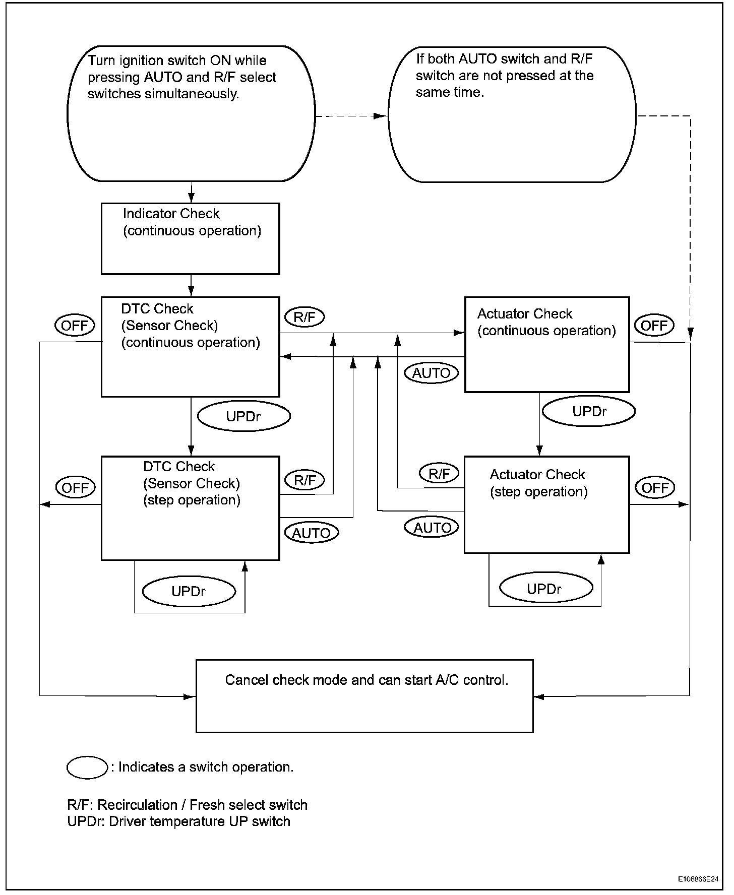 By operating the A/C control switches as shown in the diagram, it is possible to enter the diagnostic check mode.