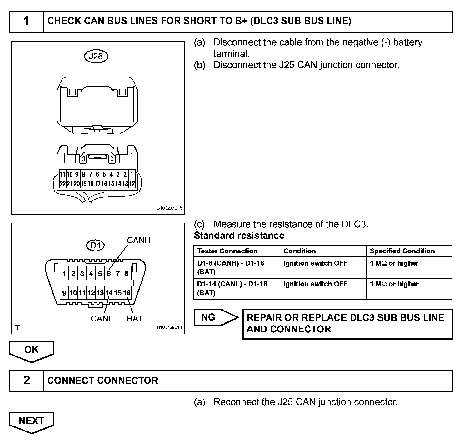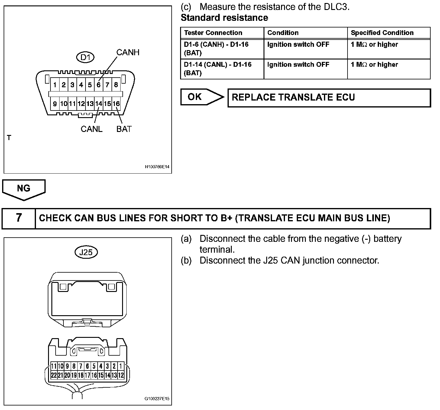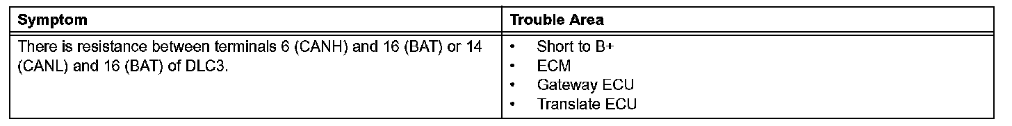 There may be a short circuit between the CAN bus line and B+ when there is resistance between terminals 6 (CANH) and 16 (BAT) or terminals 14 (CANL) and 16 (BAT) of the DLC3.