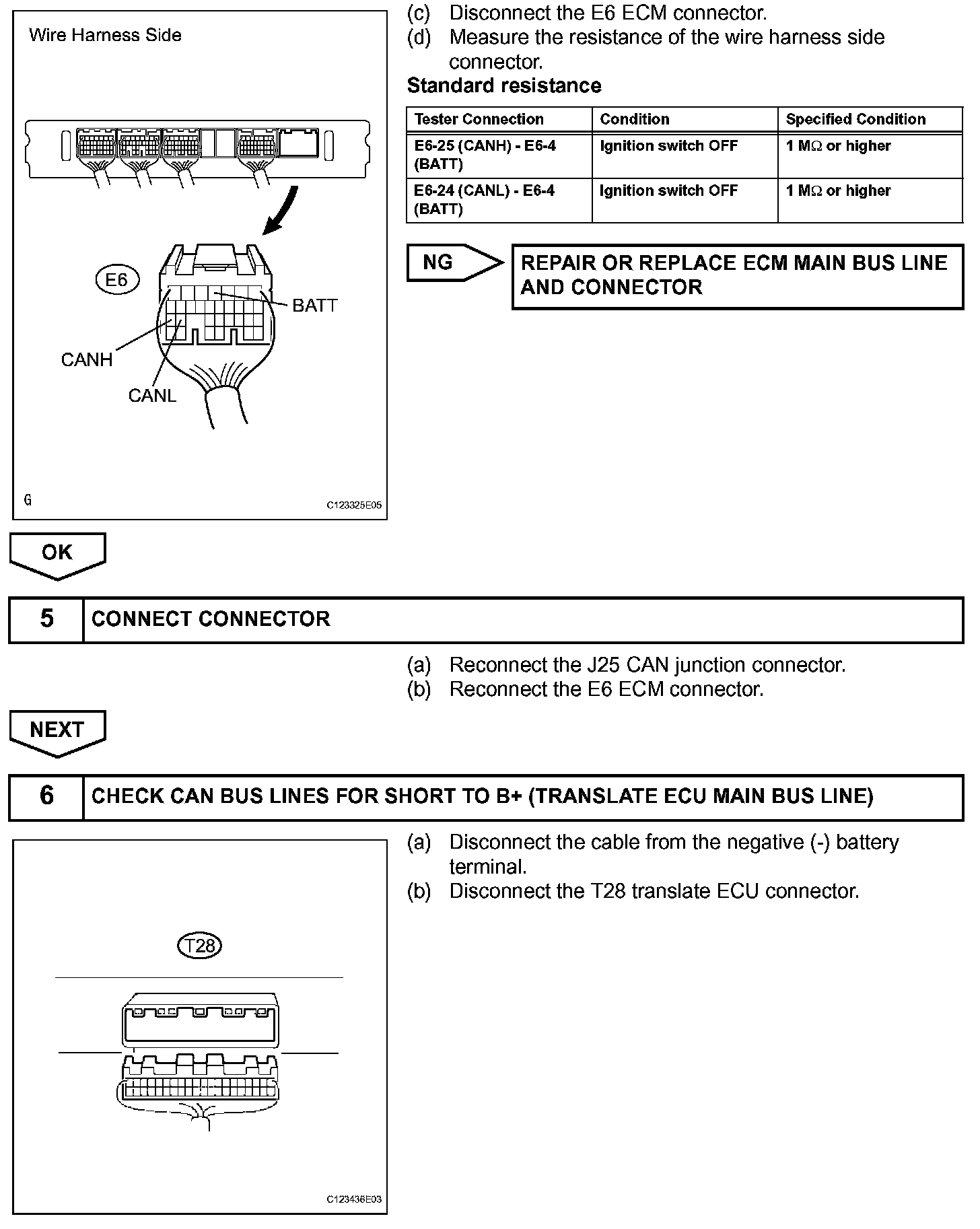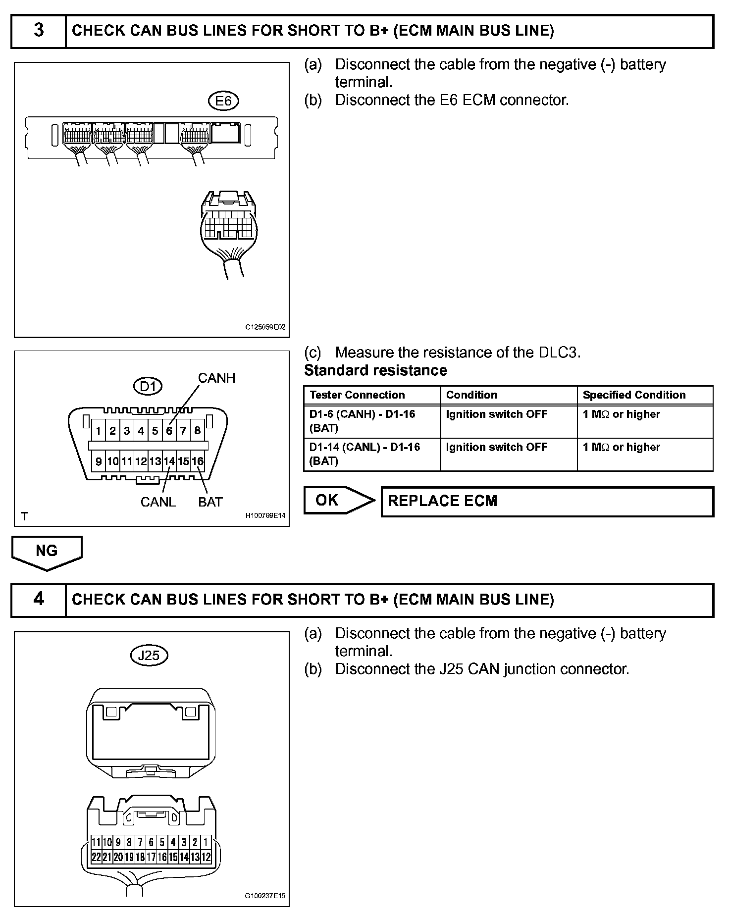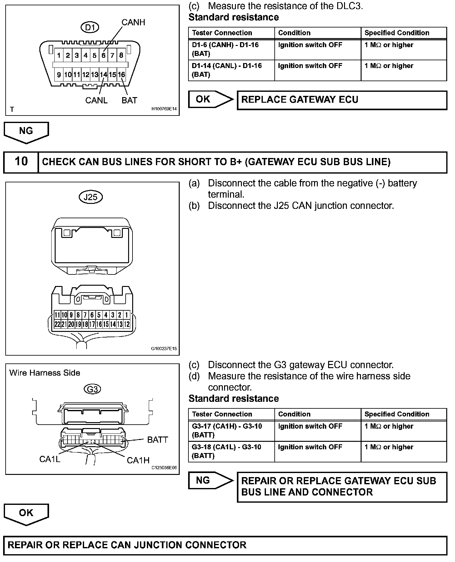 There may be a short circuit between the CAN bus line and B+ when there is resistance between terminals 6 (CANH) and 16 (BAT) or terminals 14 (CANL) and 16 (BAT) of the DLC3.