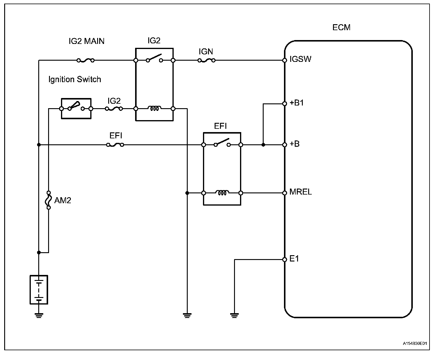 When the ignition switch is turned ON, the battery voltage is applied to terminal IGSW of the ECM. The ECM MREL output signal causes a current to flow to the coil, closing the contacts of the EFI (Marking: EFI MAIN) relay and supplying power to terminal +B of the ECM.