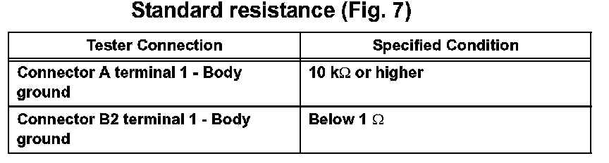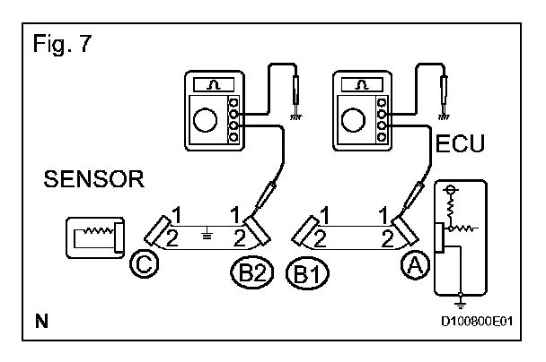 HINT: Measure the resistance while lightly shaking the wire harness vertically and horizontally. If the results match the examples above, a short circuit exists between terminal 1 of connector A and terminal 1 of connector C.
