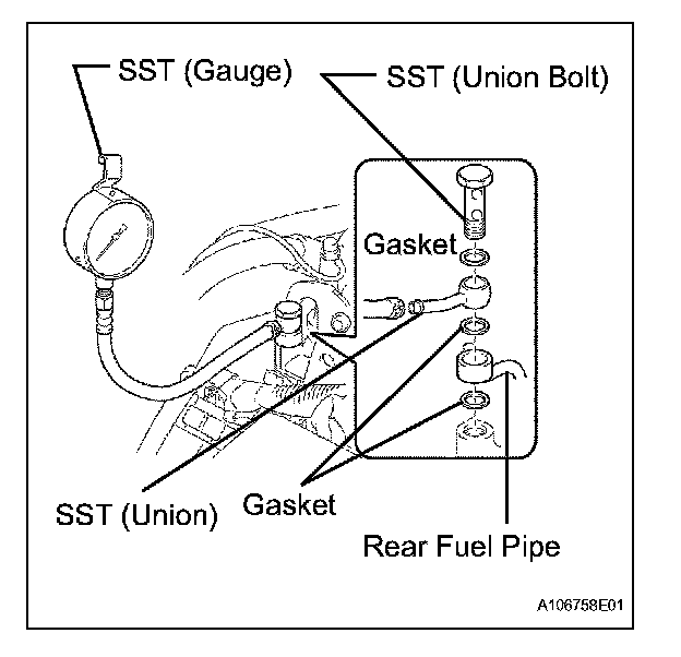 d. Install the rear fuel pipe and SST (pressure gauge) to the delivery pipe with the 3 lower gaskets and SST (union bolt).