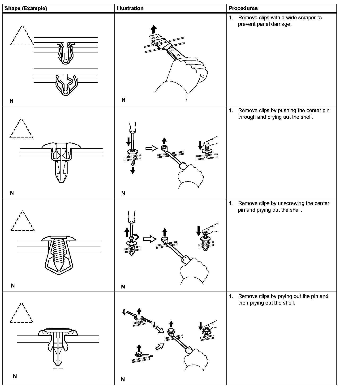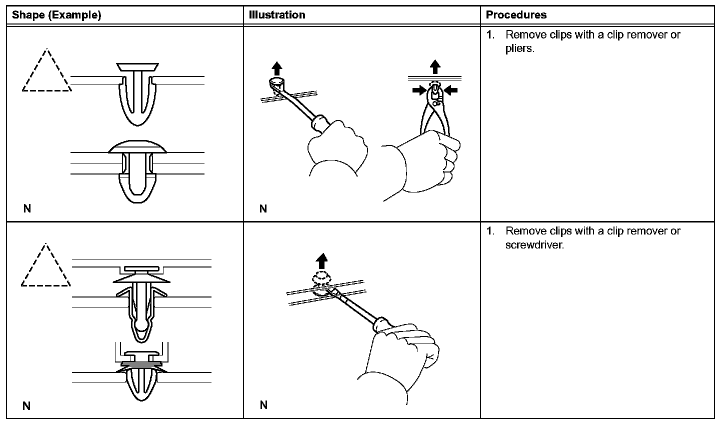 1. The removal and installation methods of typical clips used for vehicle body parts are shown in the table below.