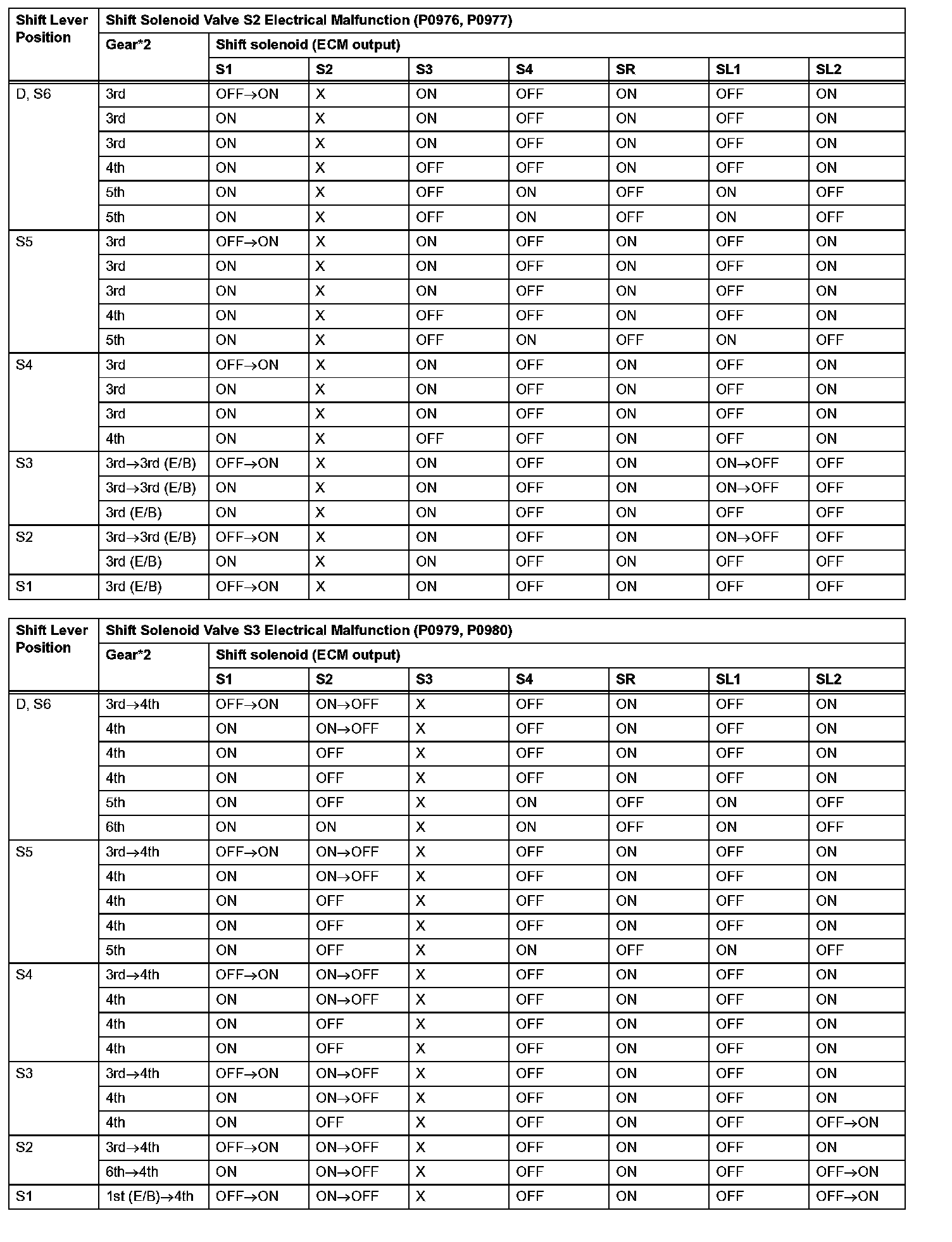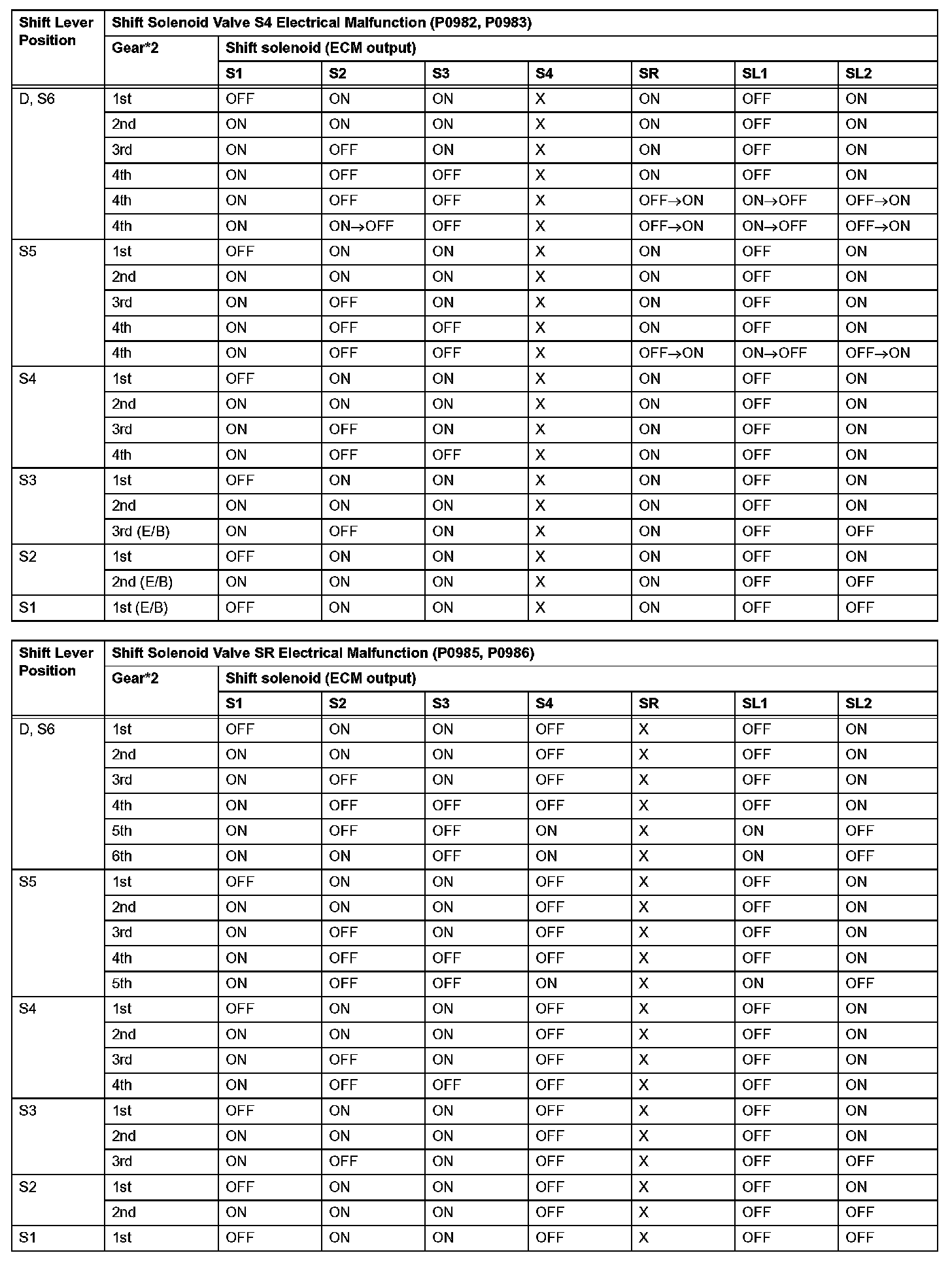 If either of the shift solenoid valve circuits has an open or short failure, the ECM turns the other shift solenoid "ON" and "OFF" in order to shift into the gear positions shown in the table.
