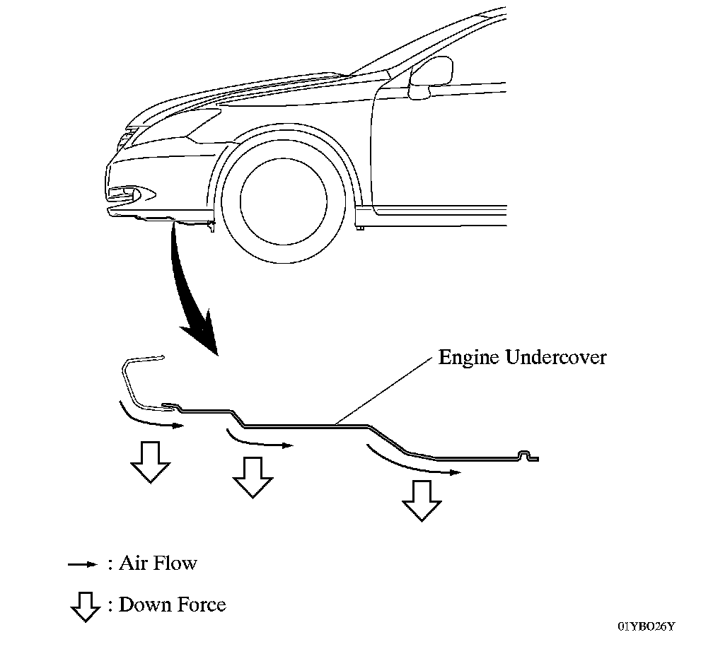 ^ The engine undercover has been formed into a step shape to increase the velocity of the air flowing underneath the vehicle. This creates a vacuum and suppresses the lift force, thus, excellent maneuverability and stability have been achieved.