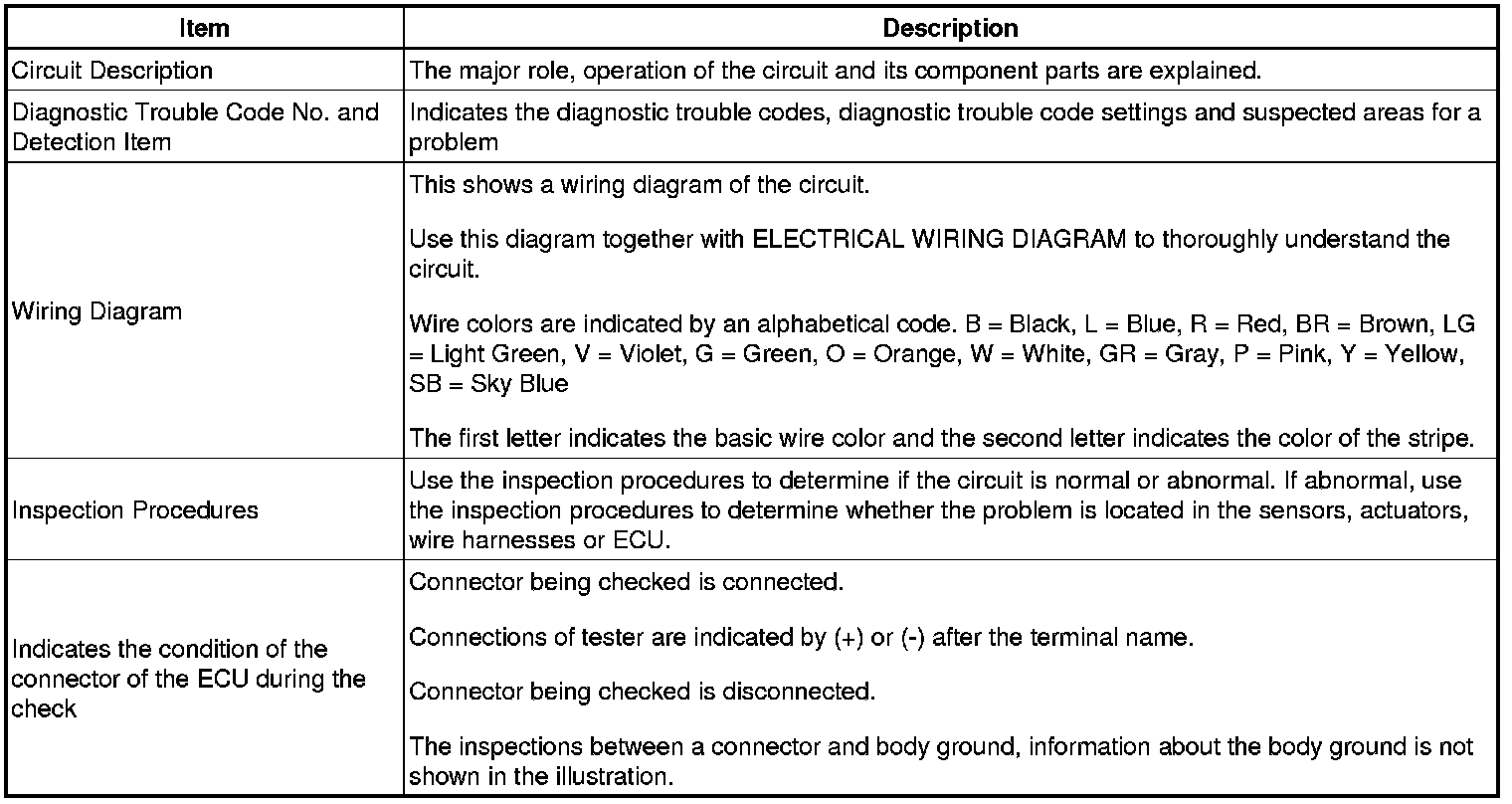 When a "Normal" code is output during a DTC check but the problem still occurs, use the Problem Symptoms Table. The suspected areas (circuits or parts) for each problem symptoms are in the table. The suspected areas are listed in order of probability. A description of each of the chart's columns is shown in the table below.