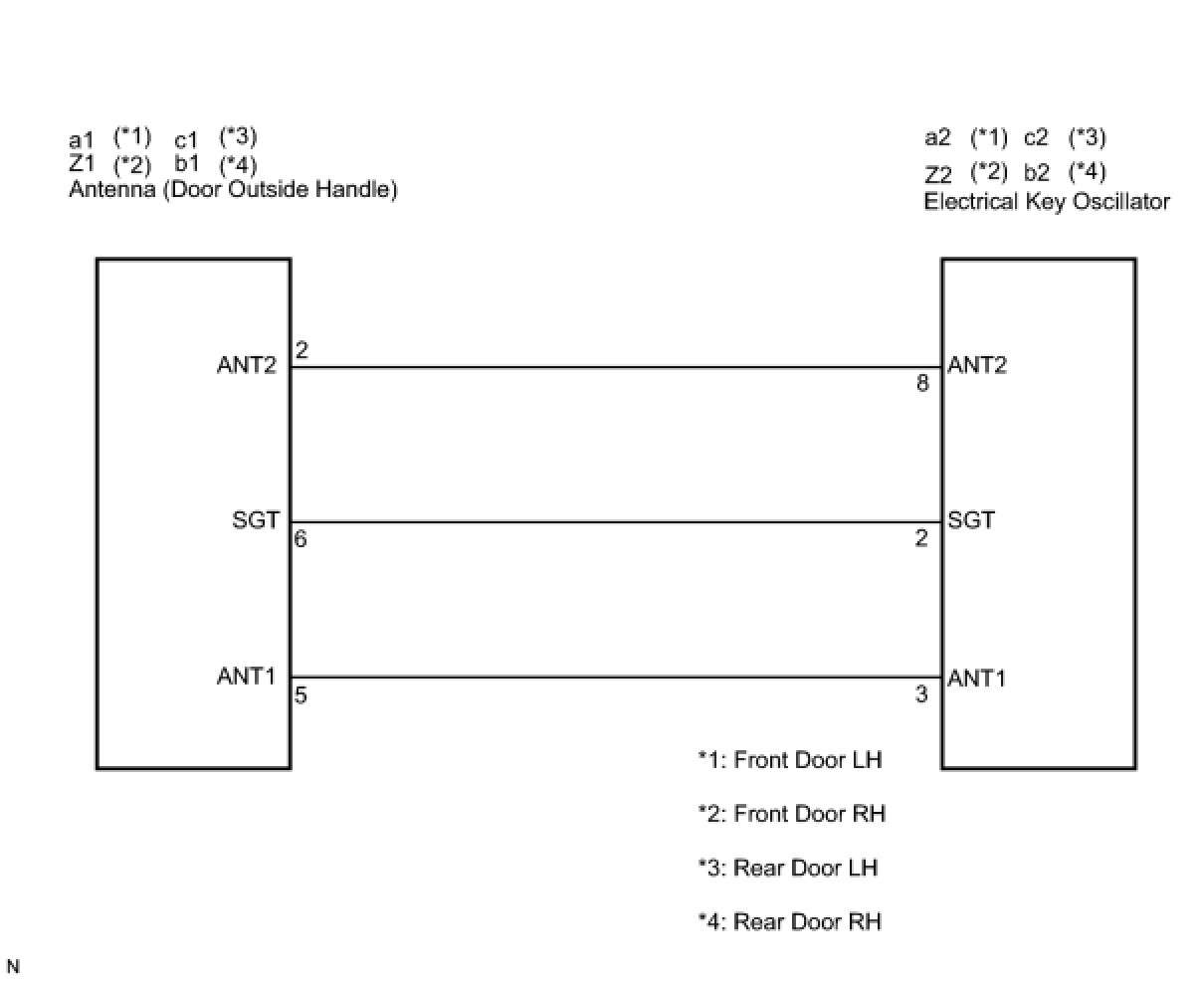 The antenna are built into the door outside handles of the all doors. Terminals ANT1 and ANT2 of the antenna (door outside handle) detect if the electrical key is within the action area around the door outside handle.