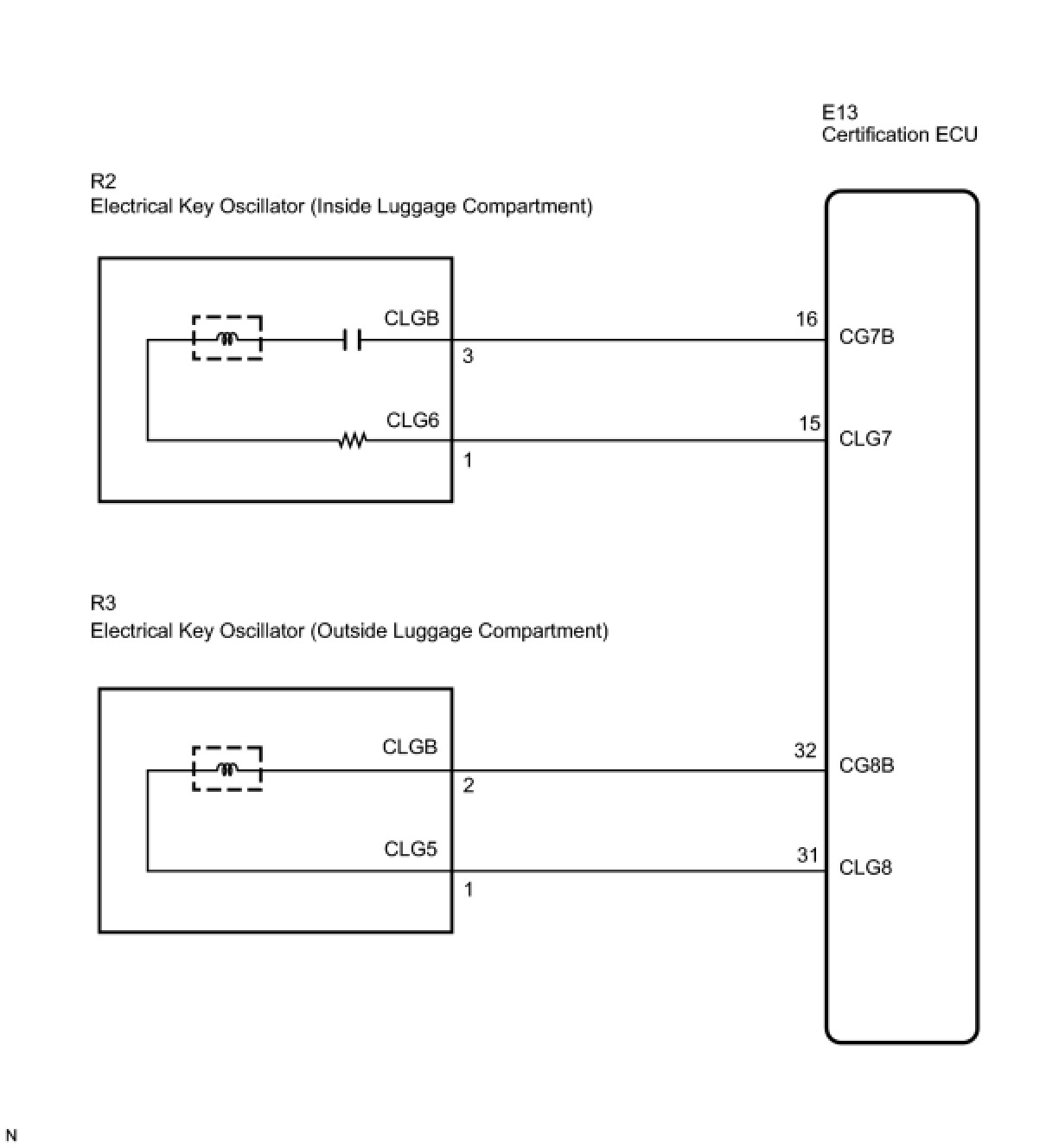 The certification ECU activates the inner and outer luggage compartment oscillators. The power is supplied from the certification ECU to both the inner and outer luggage compartment oscillators. The inner and outer luggage compartment oscillator circuits have the same wiring. If the entry luggage compartment function has a problem, check both the inner and outer luggage compartment oscillator circuits.