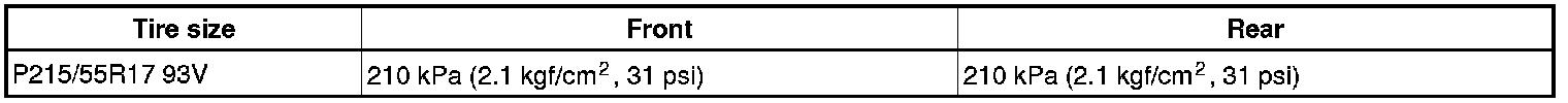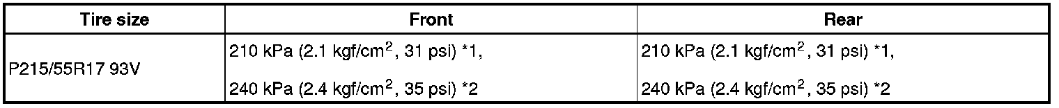 When driving under the above vehicle conditions at sustained high speeds above 160 km/h (100 mph), in countries where such speeds are permitted bylaw, inflate the front and rear tires to 240 kPa (2.4 kgf*cm2, 35 psi) provided that it does not exceed the maximum cold tire inflation pressure molded on the tire sidewall.