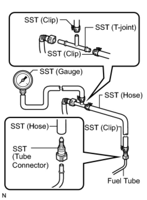(e) Install SST (pressure gauge) using SST and a fuel tube connector as shown in the illustration.