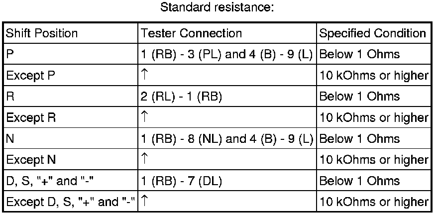 (a) Measure the resistance according to the value(s) in the table below when the shift lever is moved to each position.