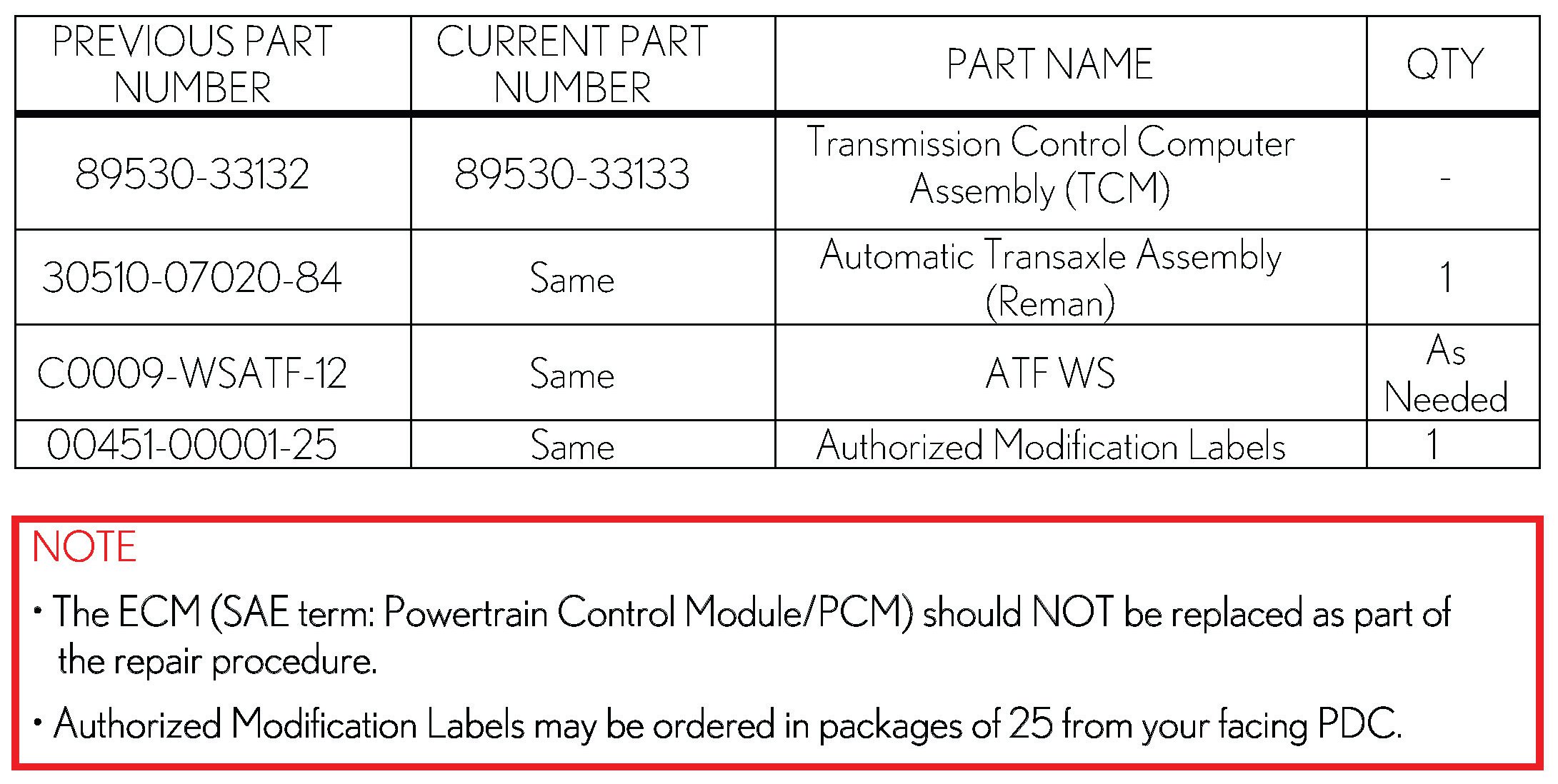 - ECM part number [Refer to the Parts Information section for the CURRENT PART NUMBER]