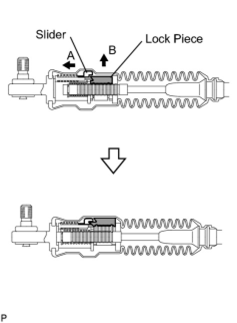 (d) Move the slider in the direction indicated by arrow A and pull up the lock piece in the direction indicated by arrow B.