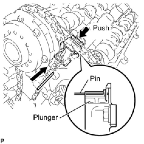 (a) While pushing down the No. 3 chain tensioner, insert a pin of dia1.0 mm (0.039 in.) into the hole to fix it in place.