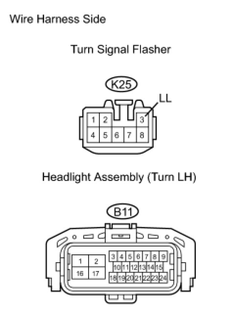 (a) Check the wire harness between the headlight (turn LH) and turn signal flasher, and the headlight (turn LH) and body ground.