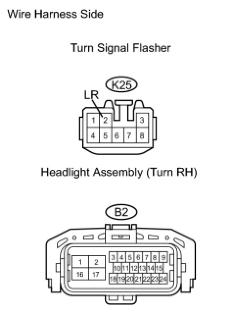 (b) Check the wire harness between the headlight (turn RH) and turn signal flasher, and the headlight (turn RH) and body ground.
