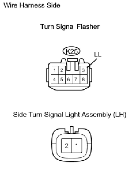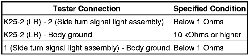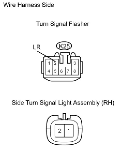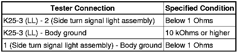 (b) Check the wire harness between the side turn signal light assembly (RH) and turn signal flasher, and the side turn signal light assembly (RH) and body ground.