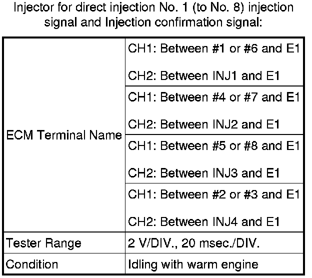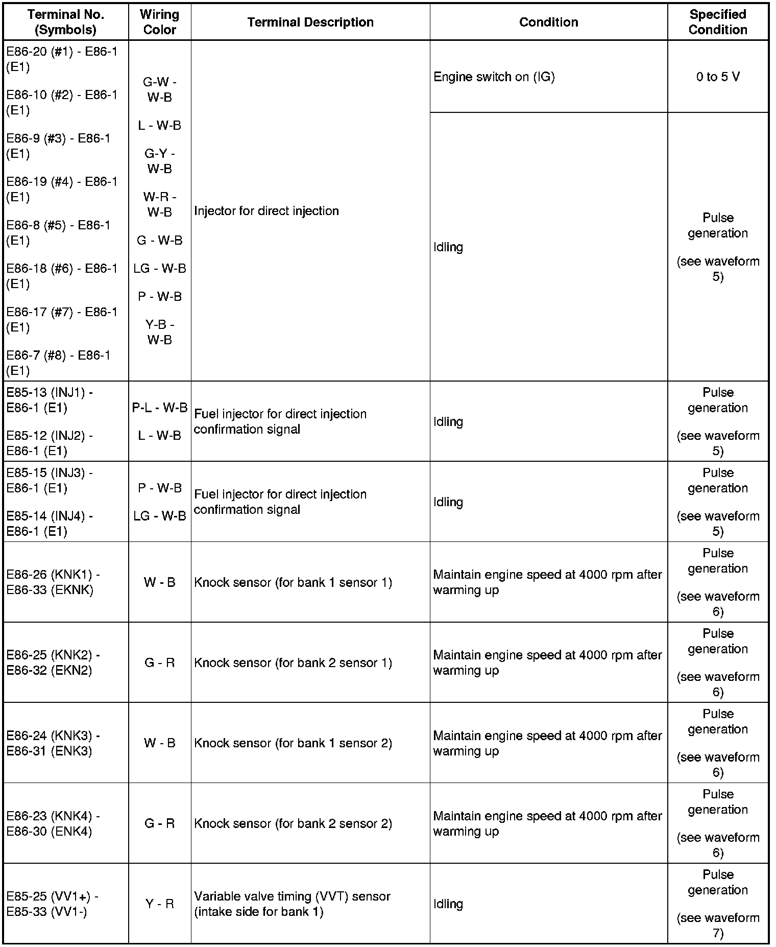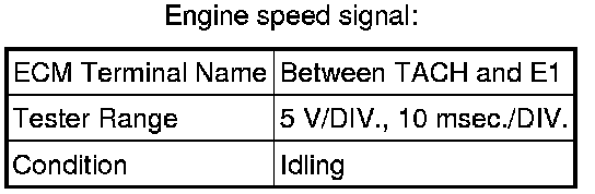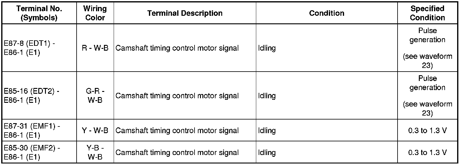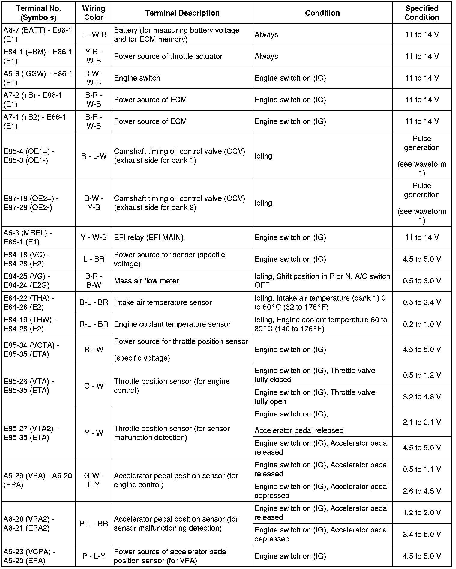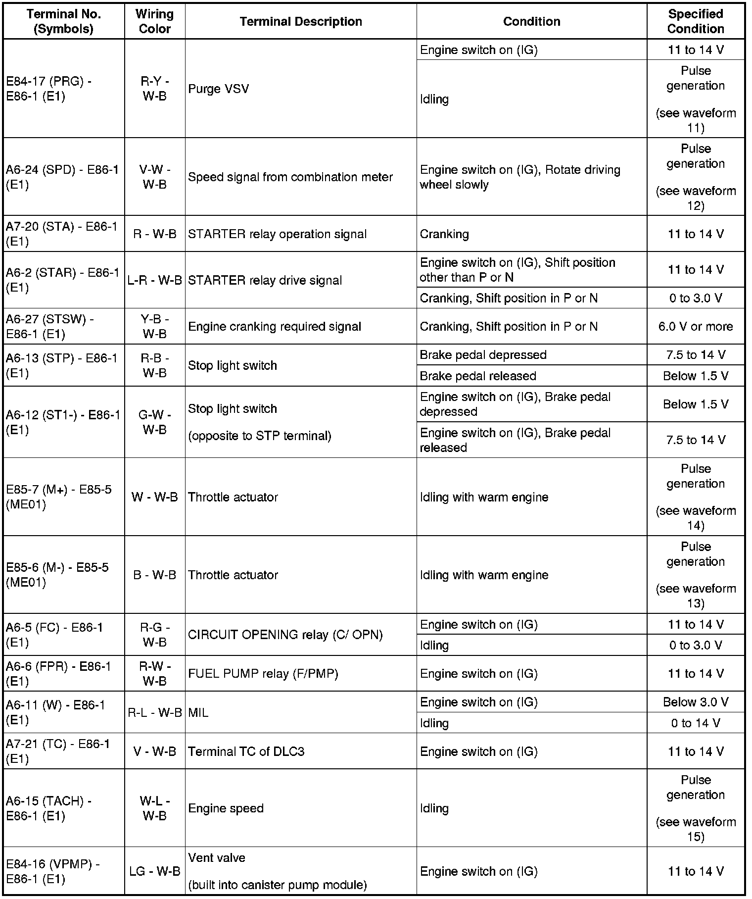 The standard normal voltage between each pair of the ECM terminals is shown in the table below. The appropriate conditions for checking each pair of the terminals are also indicated. The result of checks should be compared with the standard normal voltage for that pair of terminals, displayed in the Specified Condition column. The illustration above can be used as a reference to identify the ECM terminal locations.