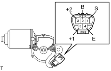 (1) Connect the positive (+) battery lead to terminal 5 (+1) of the connector and the negative (-) battery lead to terminal 4 (E). With the motor operating at low speed (LO), disconnect terminal 5 (+1) to stop the wiper motor operation at any position other than the automatic stop position.