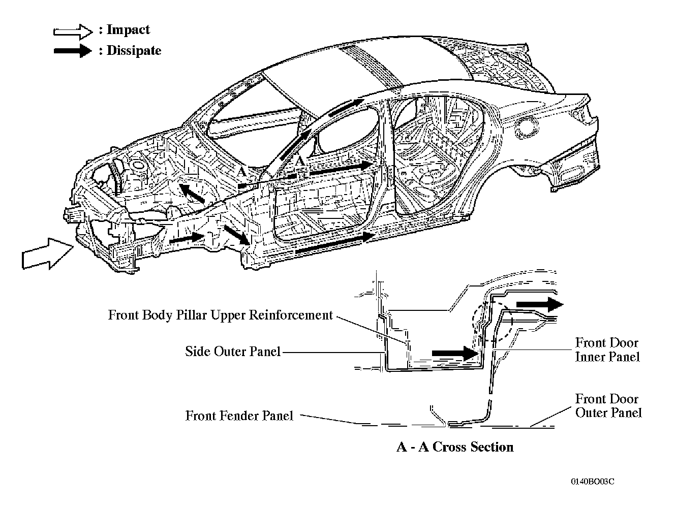 ^ The Minimum Intrusion Cabin System strengthens inner door reinforcements and reduces the gap between the door inner panel and the pillar. This communicates impact load to the door belt line reinforcement, reducing load to the pillar in the event of an offset frontal collision.