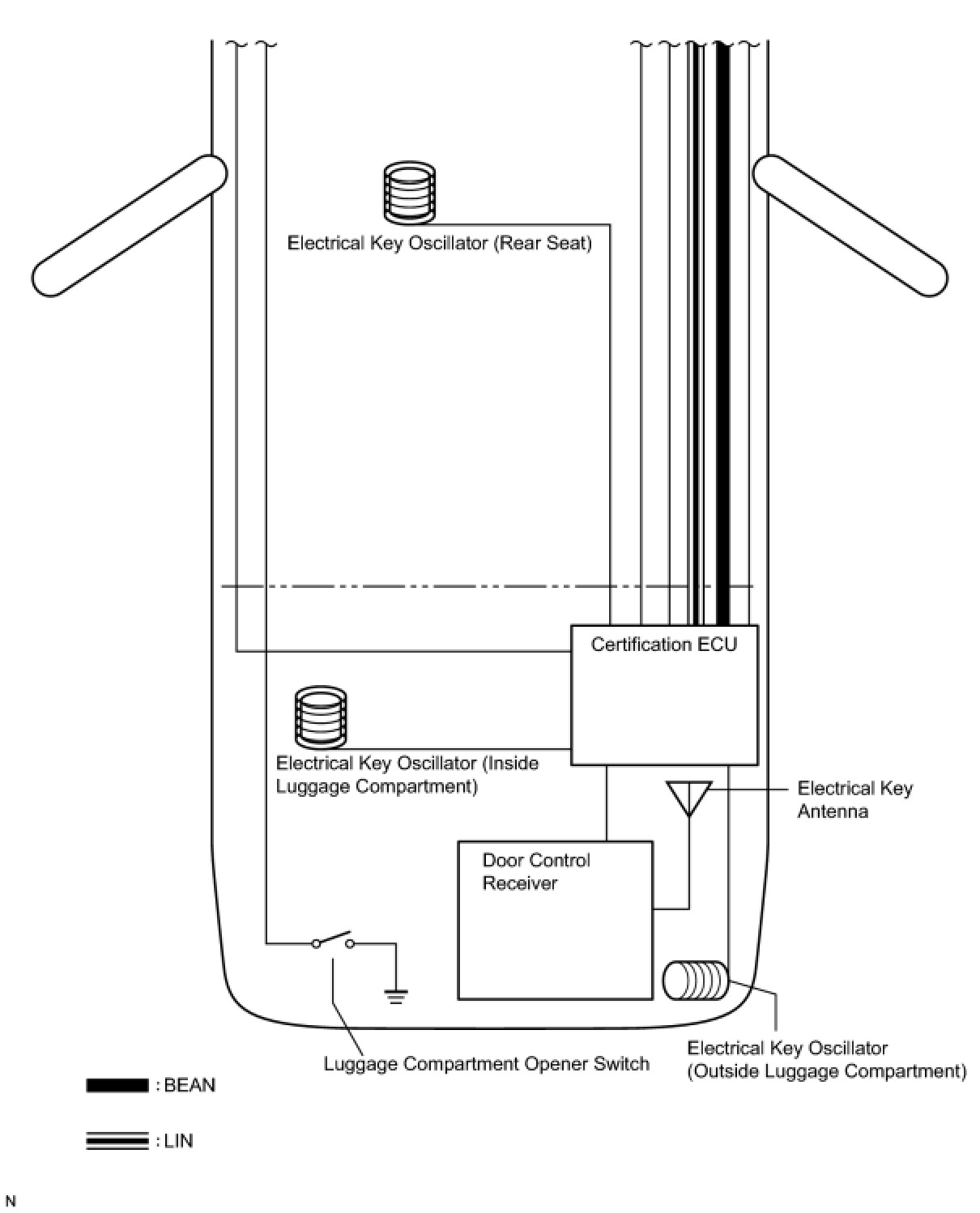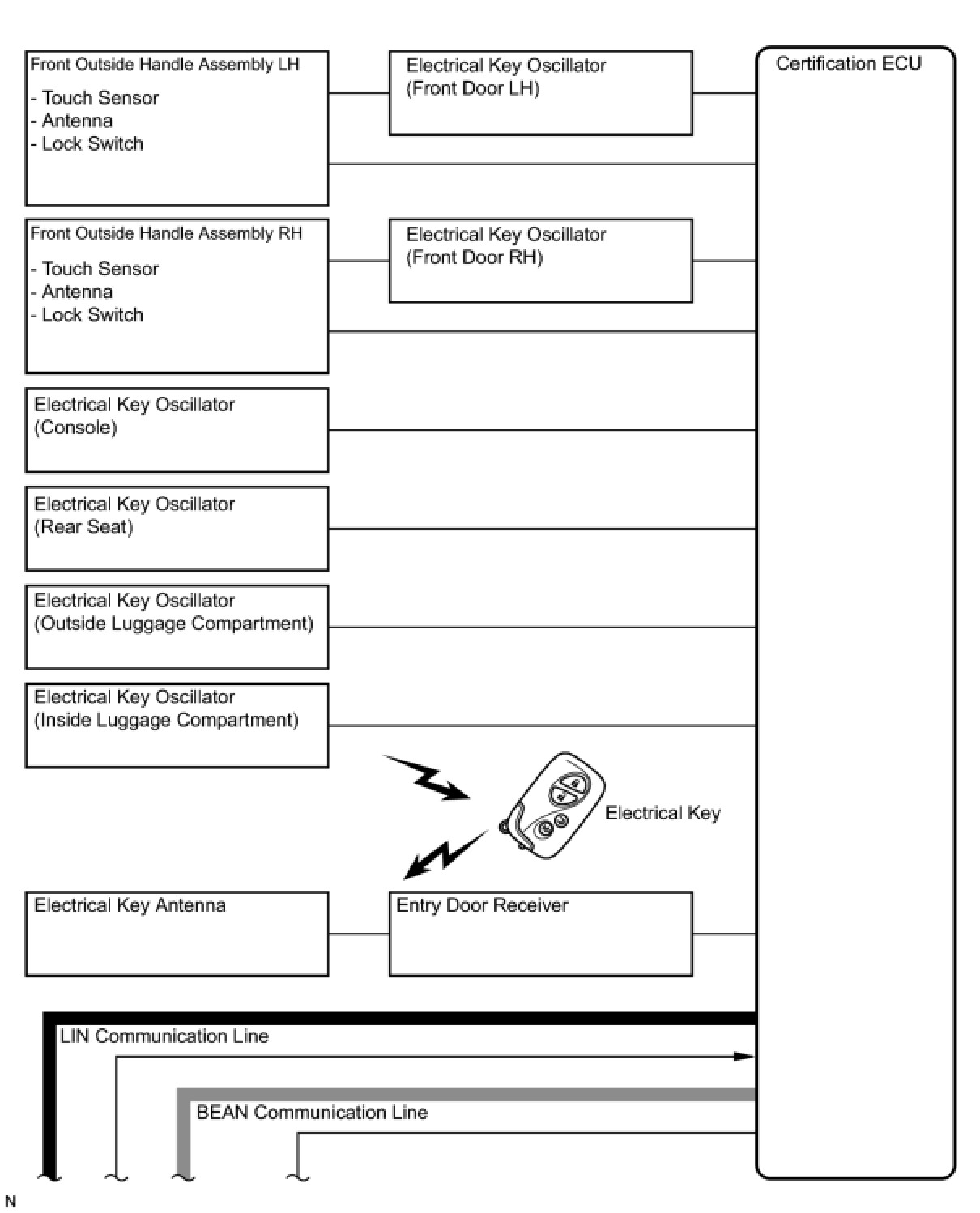 - The detection area of each door oscillator is formed by transmitting a request signal every 0.25 seconds while the engine switch is off and each door is locked. In this way, it detects the proximity of a electrical key. During entry lock, the detection area is formed with the lock switch ON.