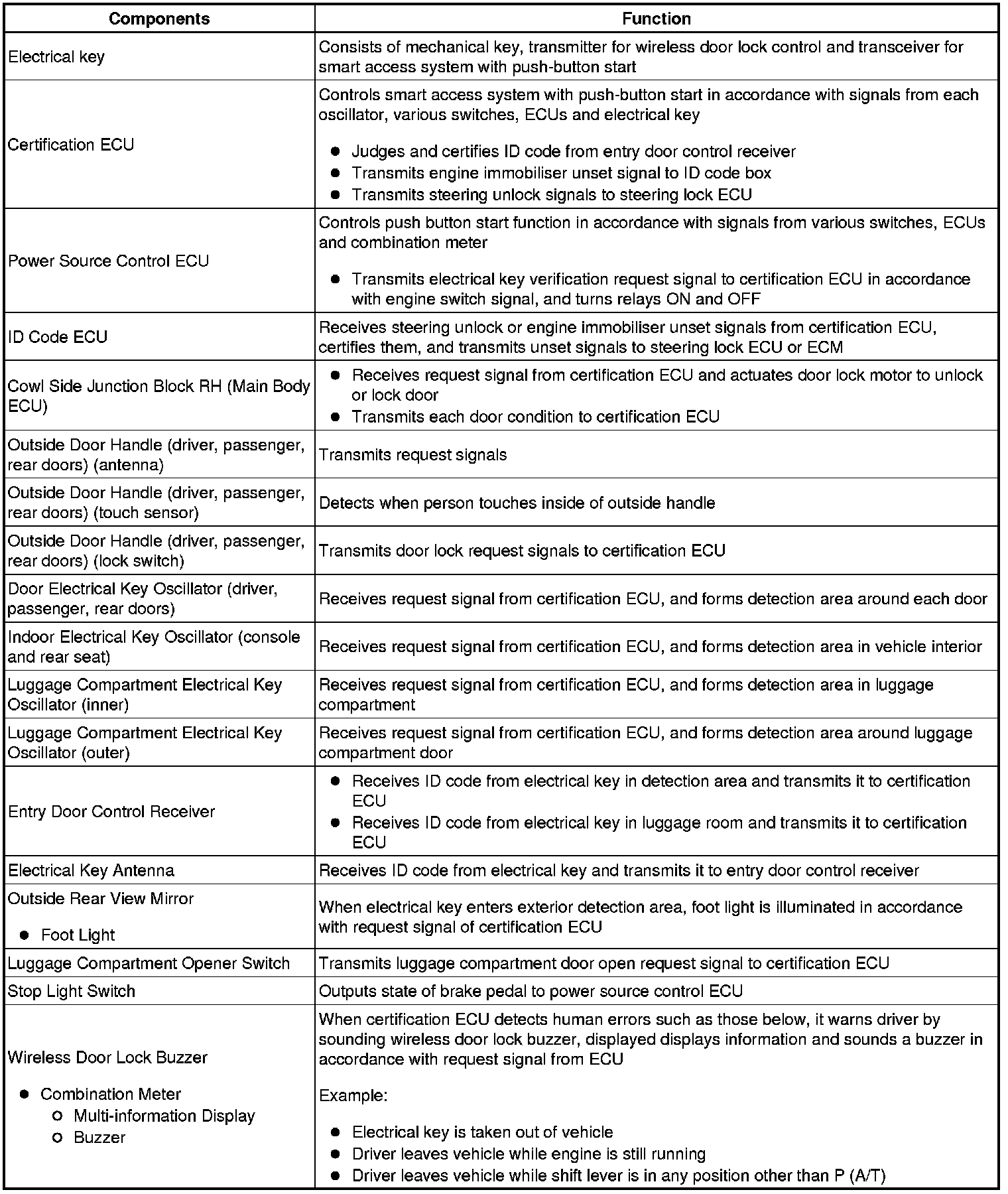 (a) In addition to conventional mechanical key and wireless door lock control functions, the entry and start system enables door locking/unlocking, steering lock releasing, engine starting and luggage compartment door opening without operating the electrical key. The only requirement is that the electrical key is in the user's possession.