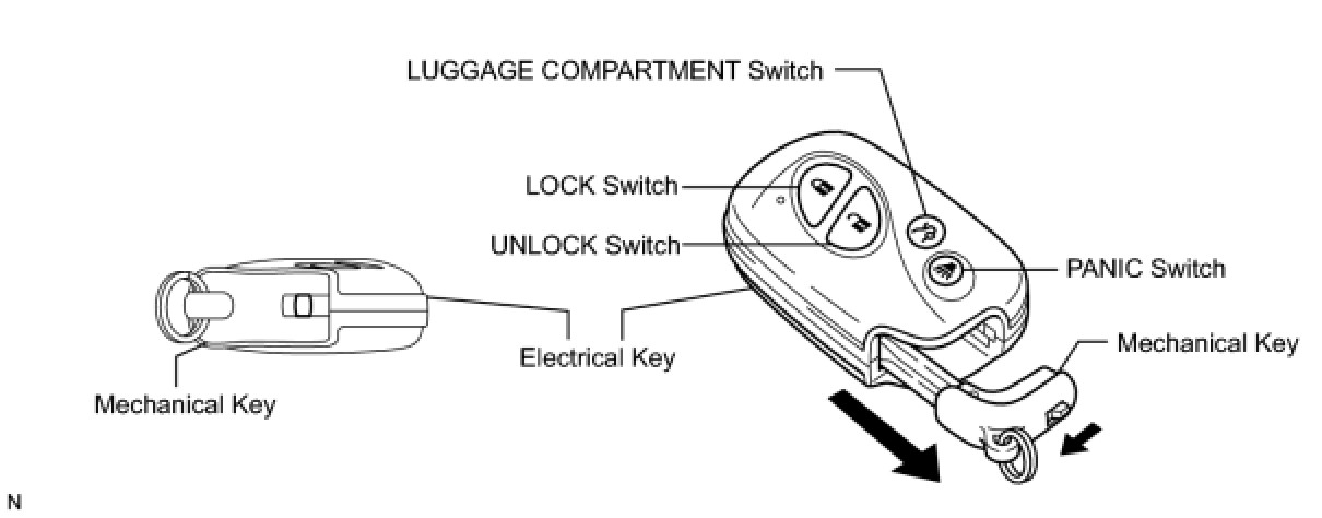 Push the LOCK/UNLOCK/PANIC/LUGGAGE COMPARTMENT switch on the electrical key to operate each function. For details, Description and Operation.